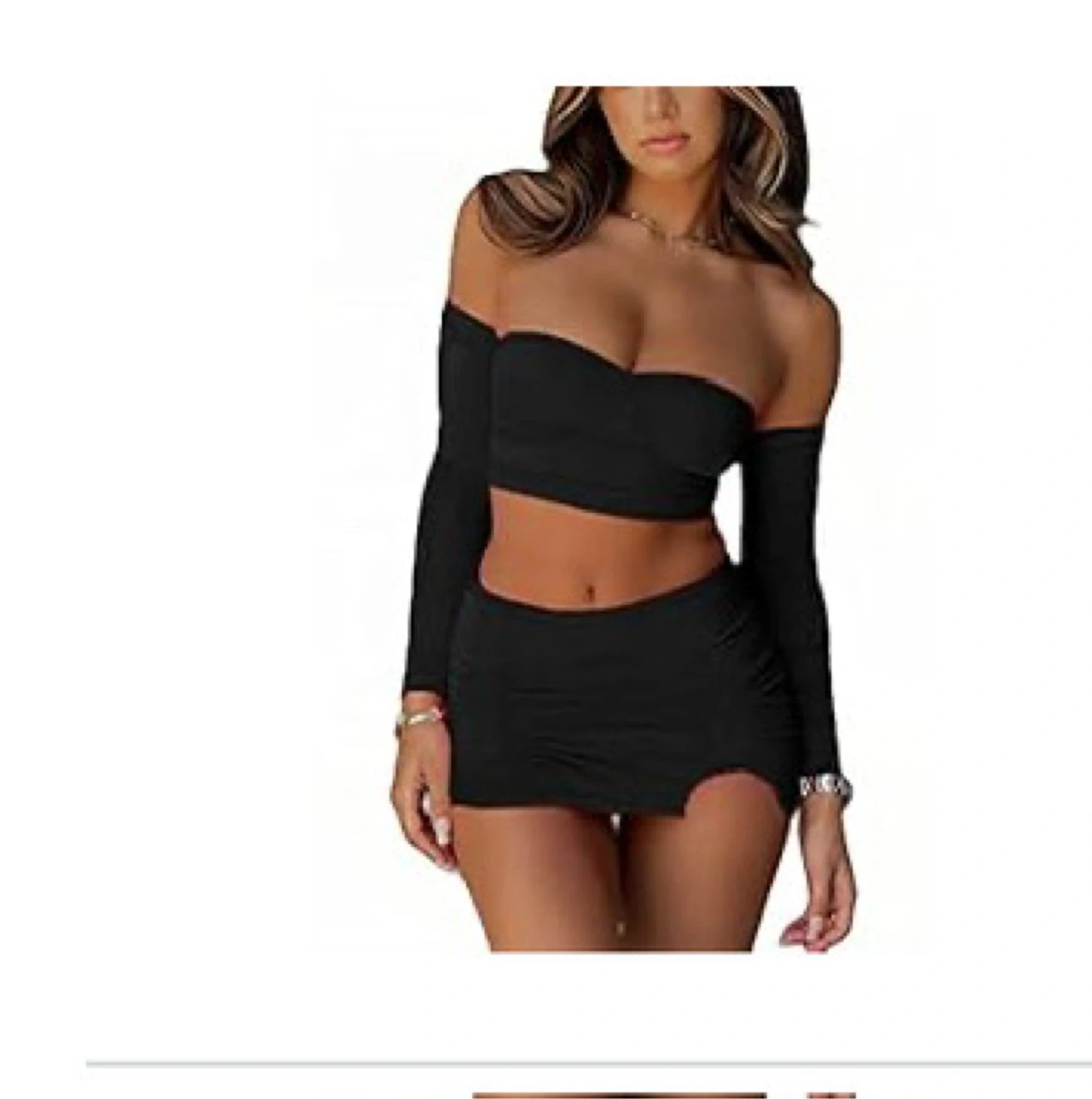 This is a stylish black two-piece skirt set. It features a tube top and a mini skirt. Perfect for a night out or a special occasion!