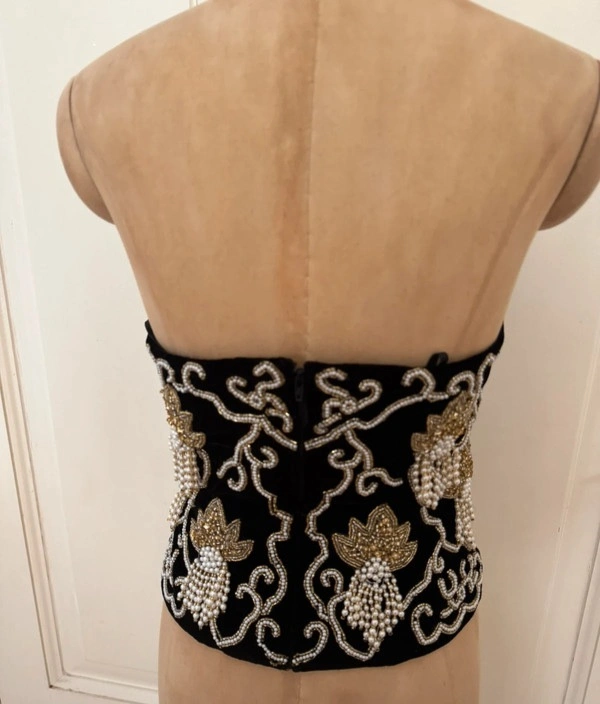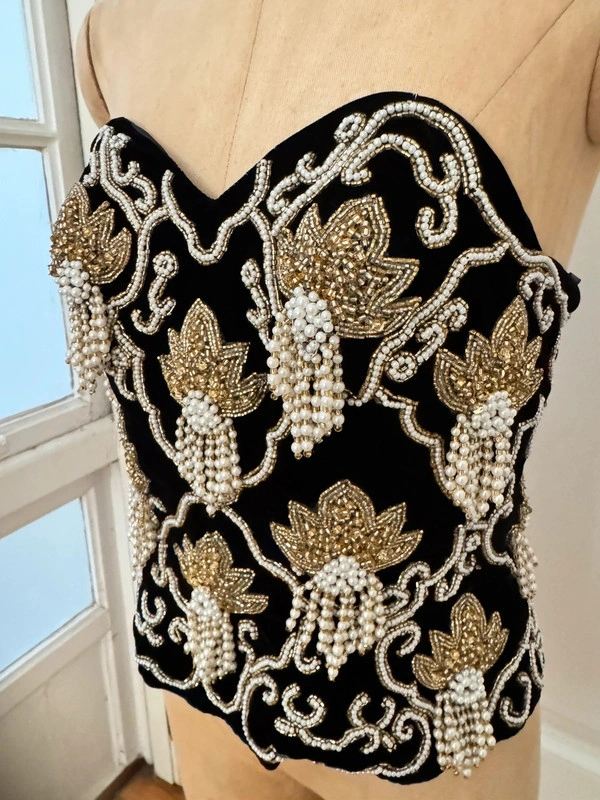 Beautiful black velvet corset top with intricate gold and pearl-like beadwork! It's in great condition and ready to add a touch of elegance to any outfit