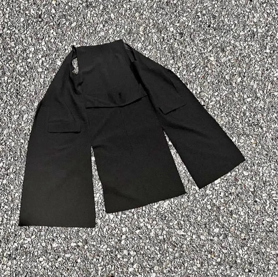 Black, vintage, coat, gilet, sleeveless, minimalist, oversized, textured fabric.