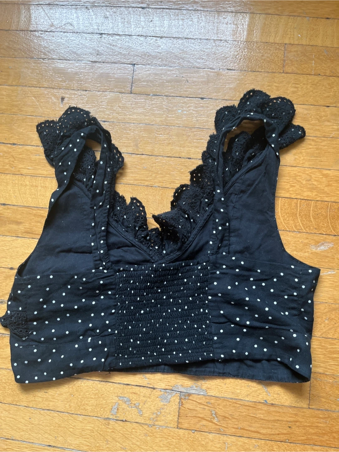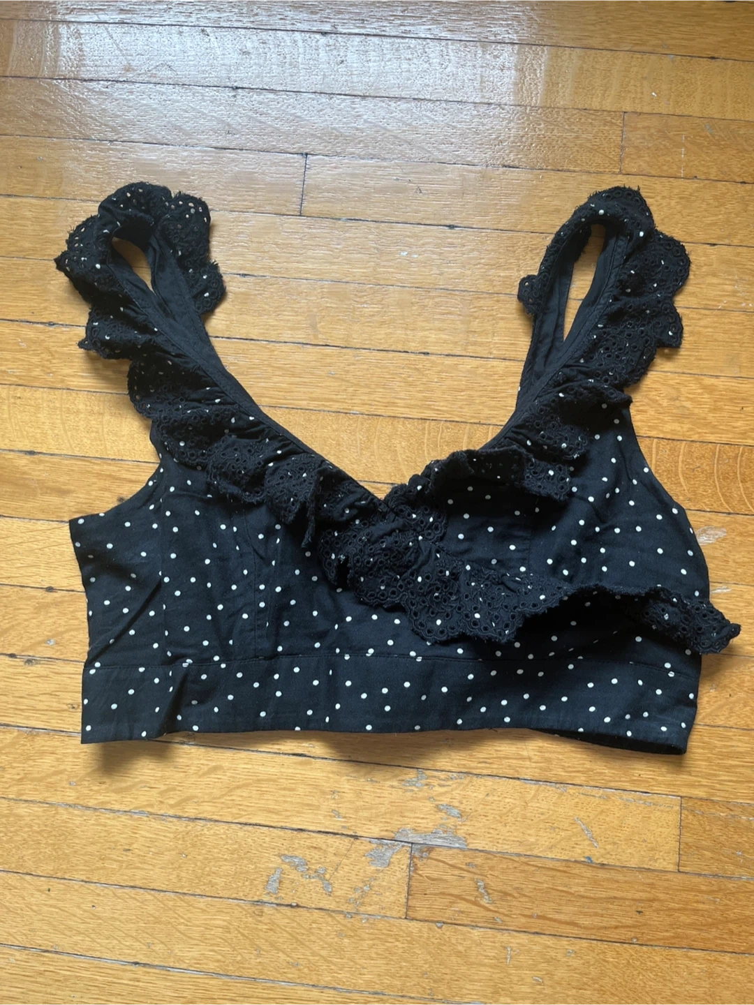 Cute black crop top with white polka dots! It has a ruffled neckline and a stretchy, fitted bodice.