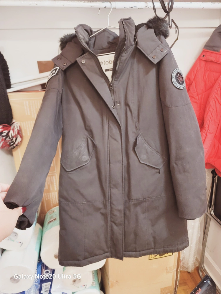 Black winter jacket with fur hood. Long sleeves. Zipper and button closure. Two front pockets. used one winter very warm does not fit anymore hence selling. pick up only
