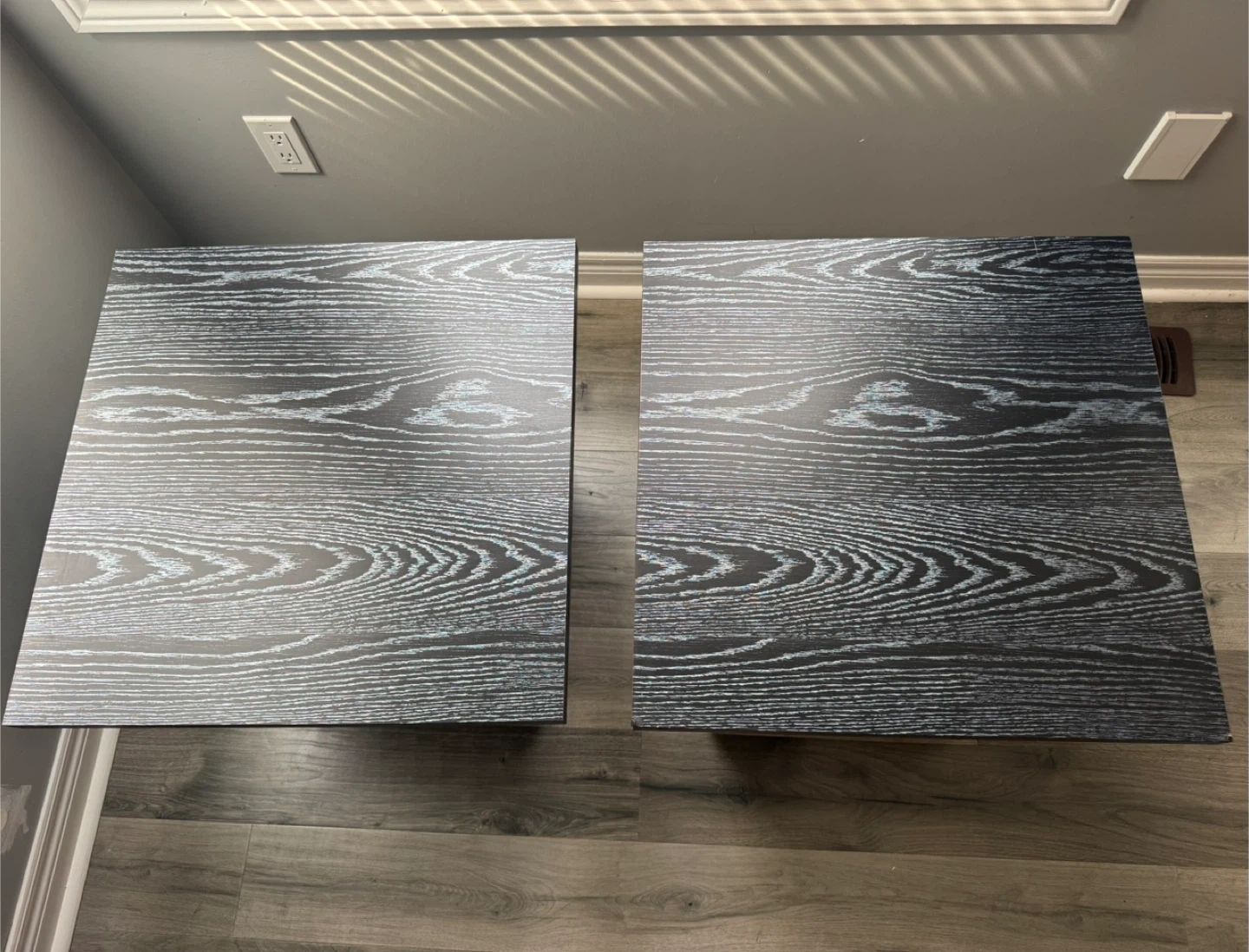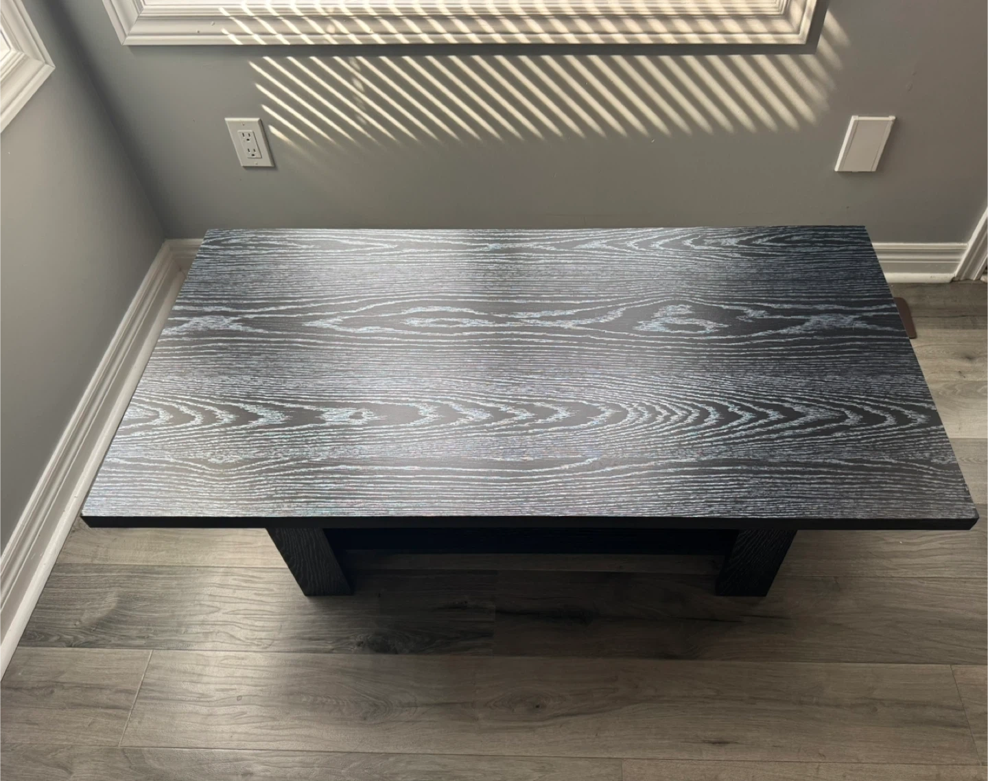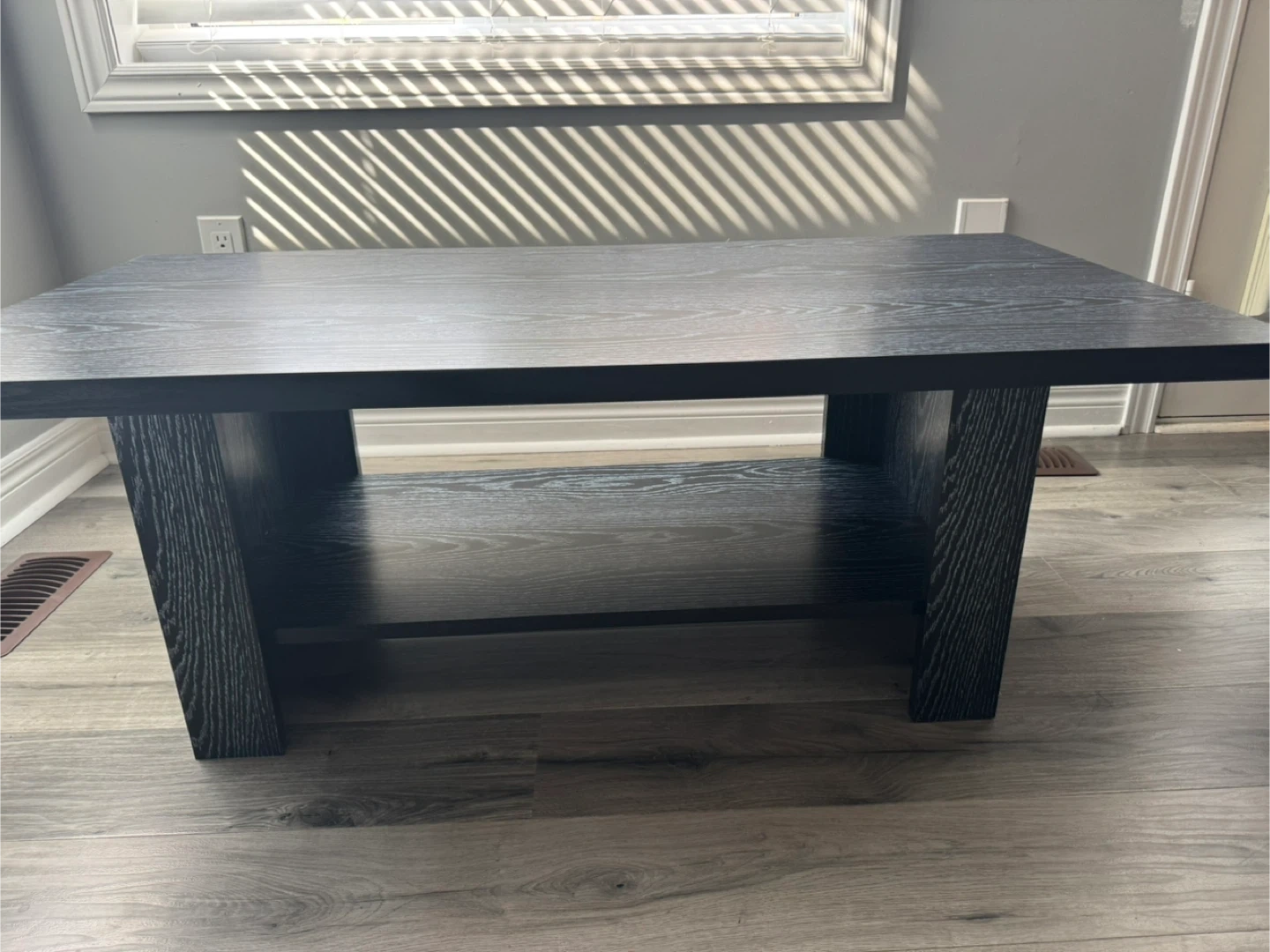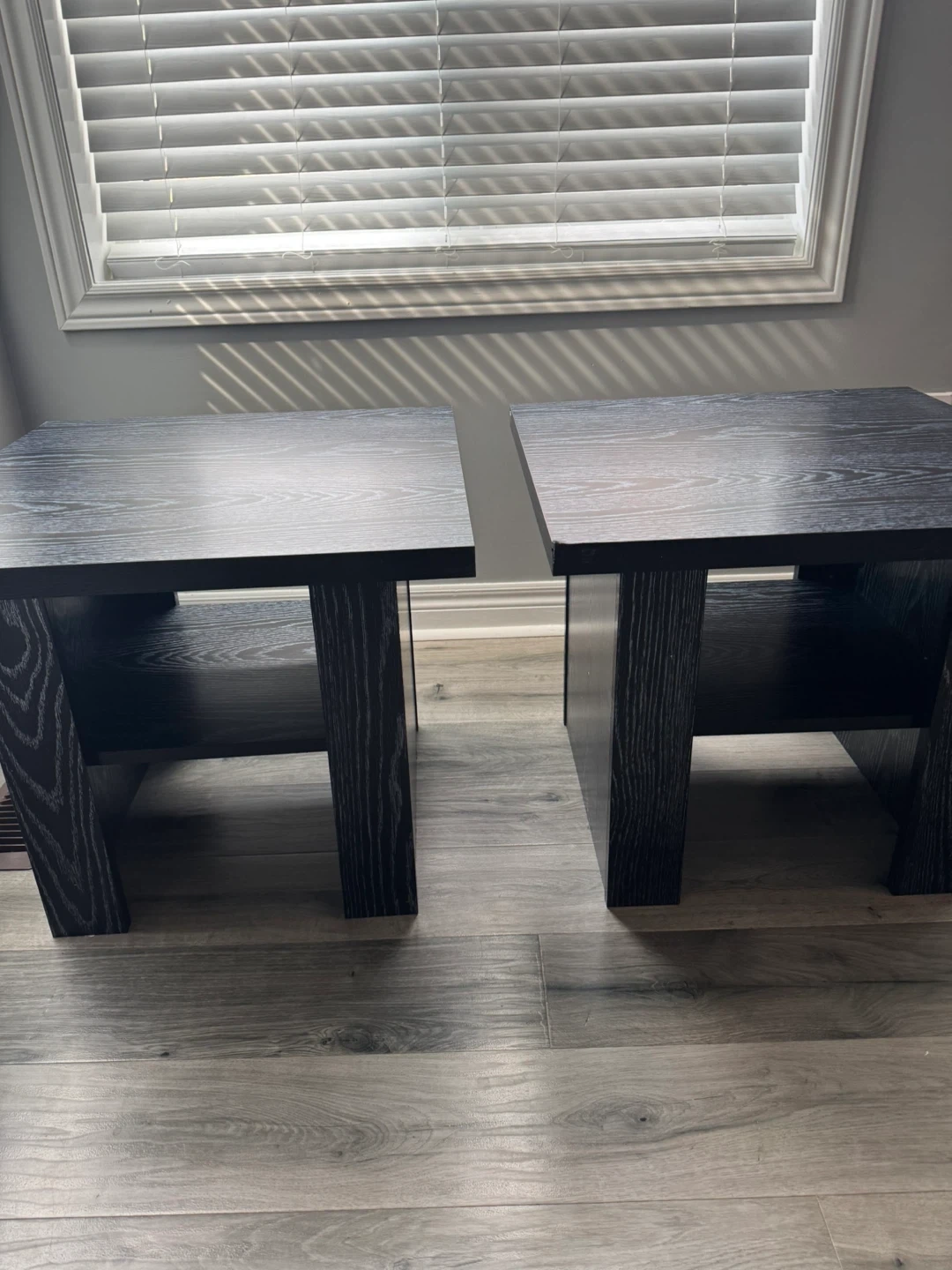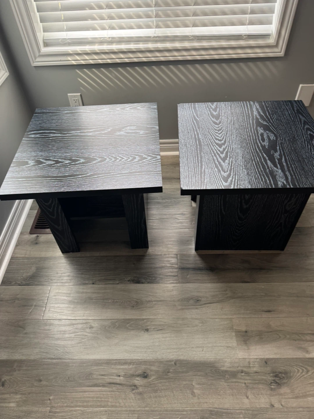 Selling a set of black wood coffee table and two matching side tables. They're in great condition and would look great in any living room or den. The wood grain is really nice! Coffee Table 47.25L 23.5W 17.25H End Tables 23.5x23.5 20.25H These are brand new but have some nicks from shipping. Retail for $450+ Located in Bowmanville