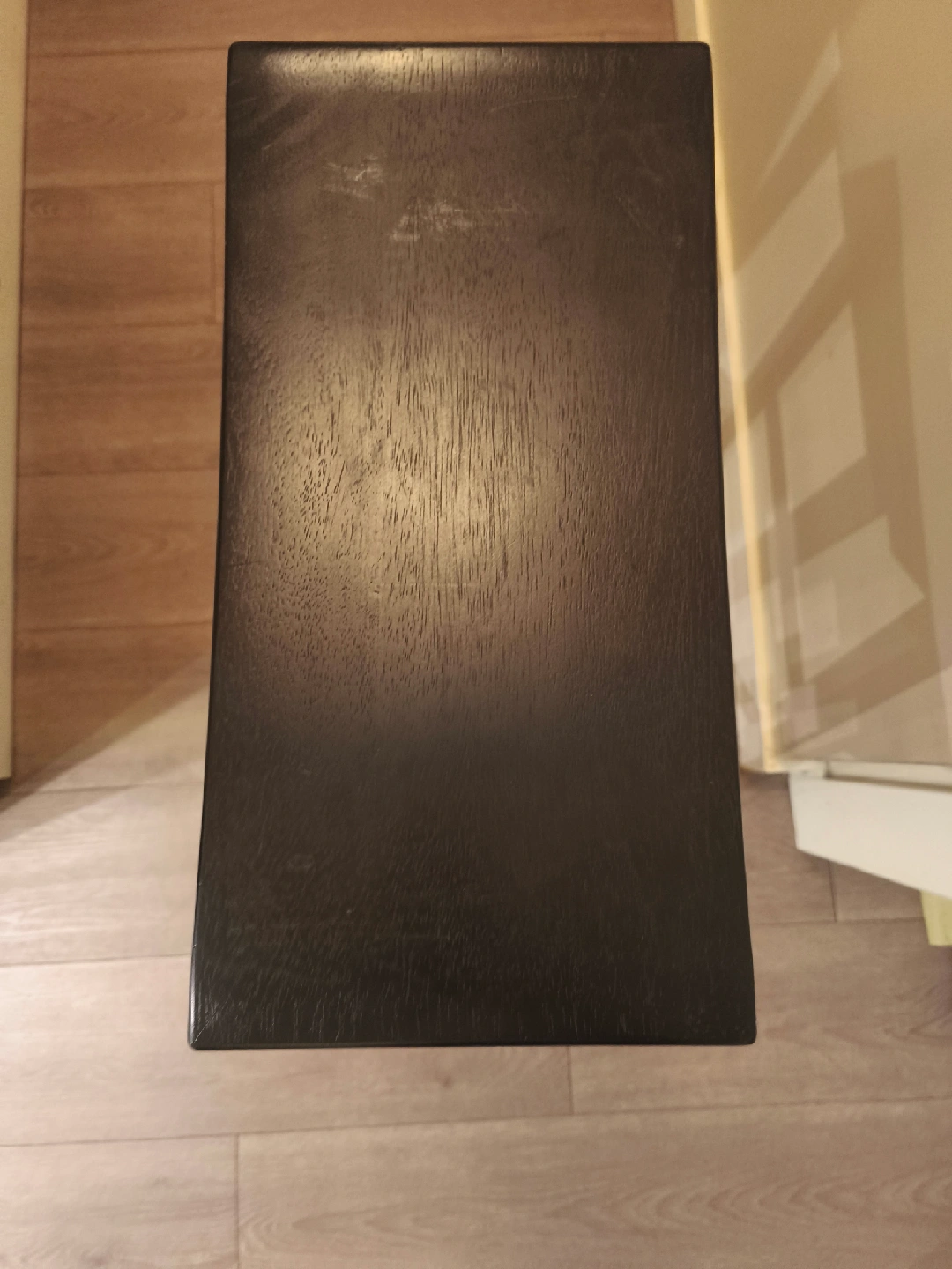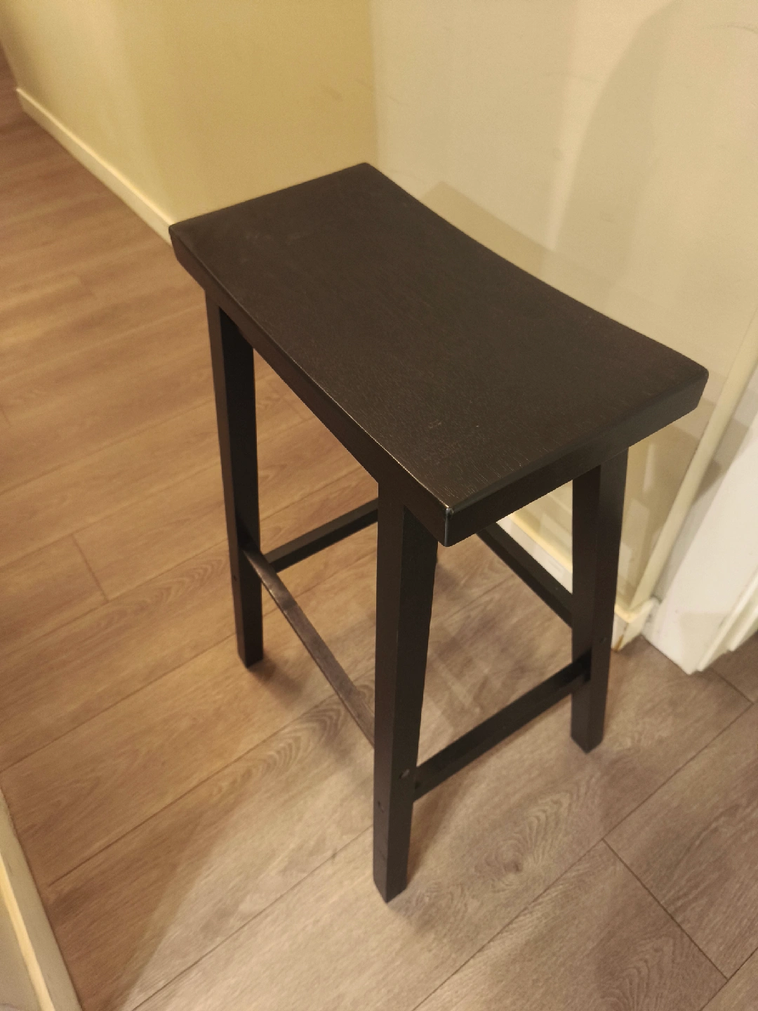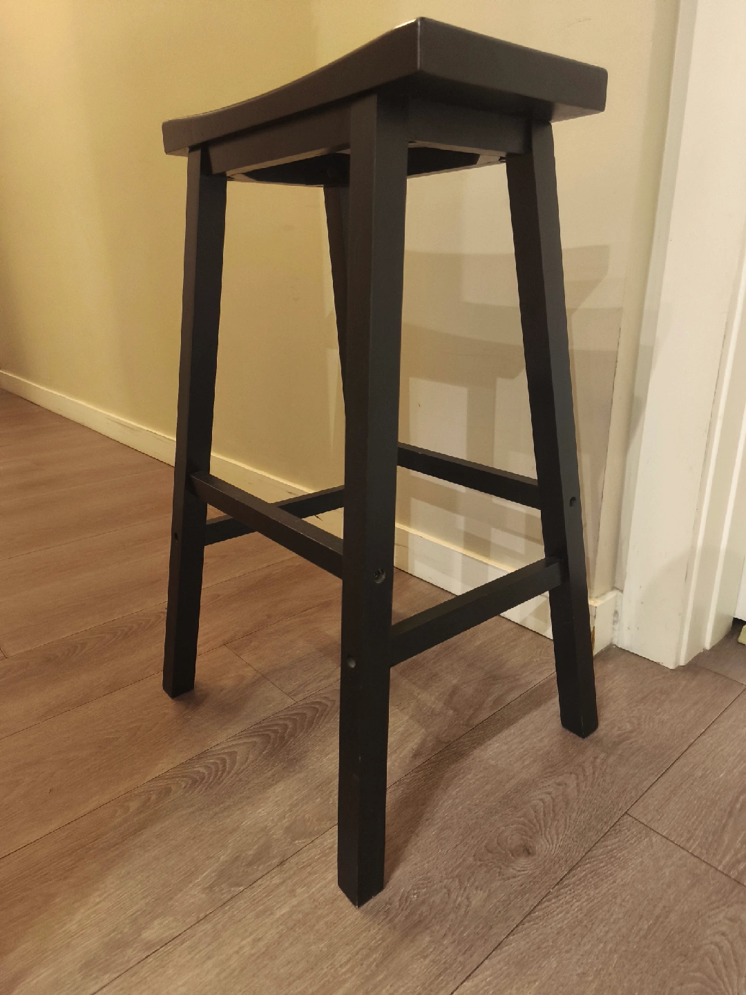 Selling a black wooden bar stool. It's in good condition and would be great for a kitchen island or bar area. It has a simple and classic design that would fit well with most decor styles. Height is around 74cm.
