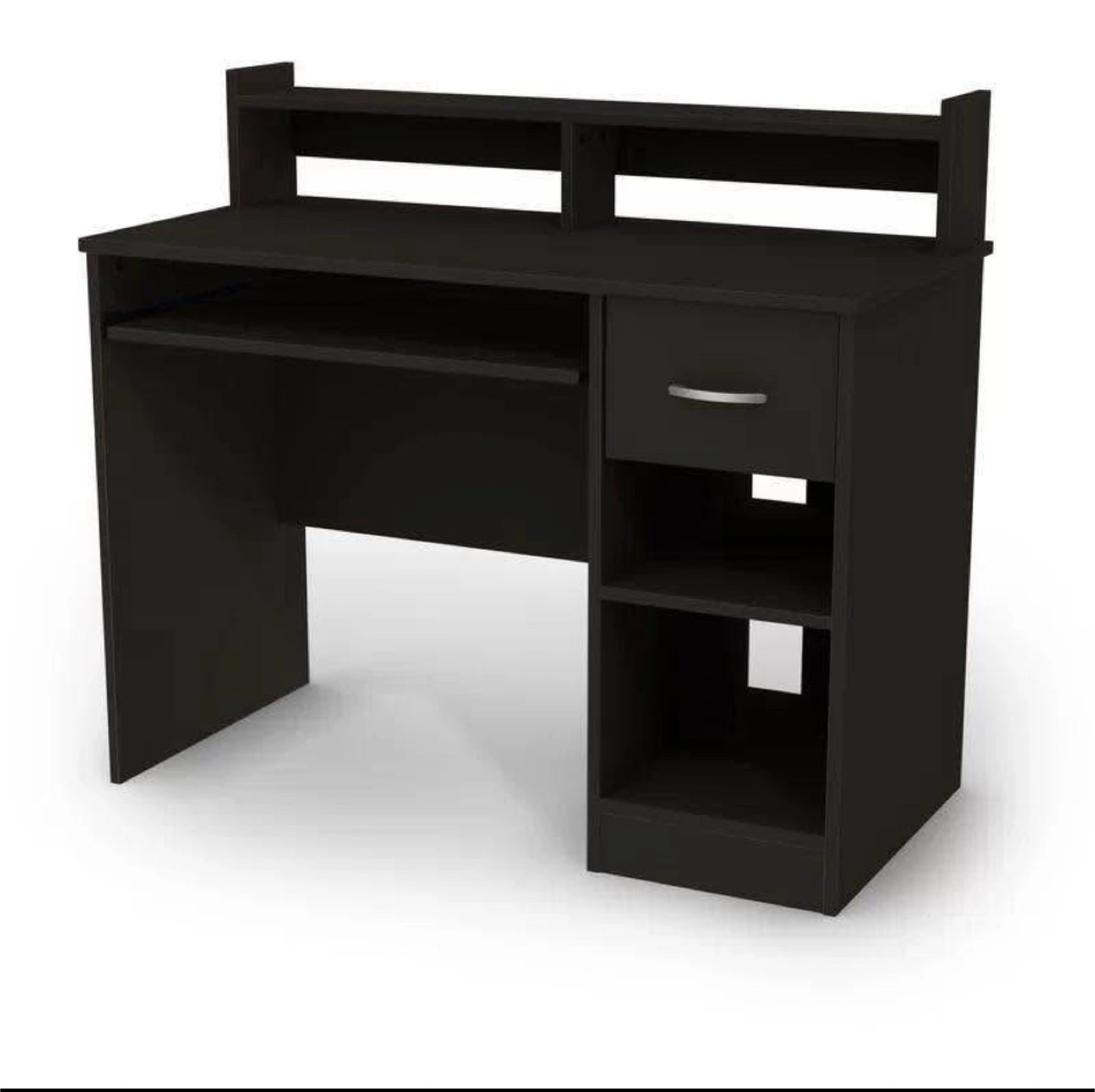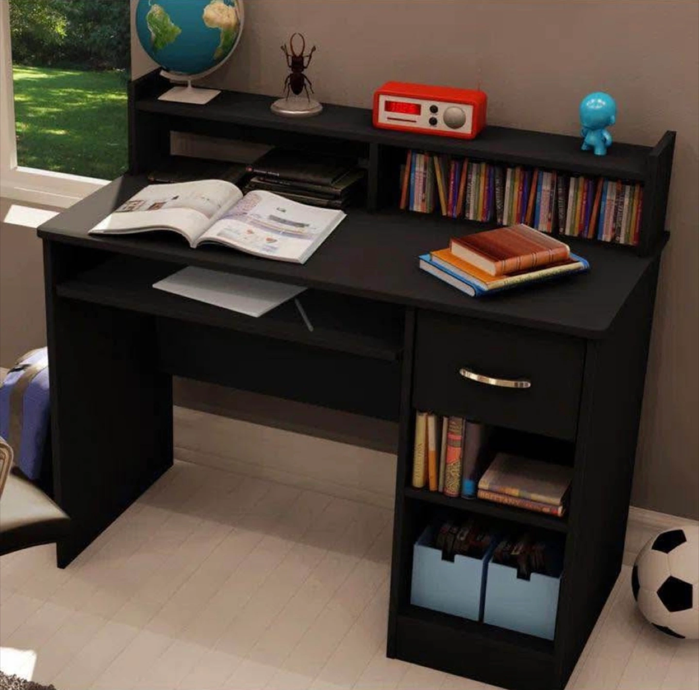 Selling a black wooden desk with a hutch, perfect for a student or home office setup. It features a keyboard tray, a drawer, and open shelving for storage. The desk is in great condition and ready for a new home! Its from Wayfair.