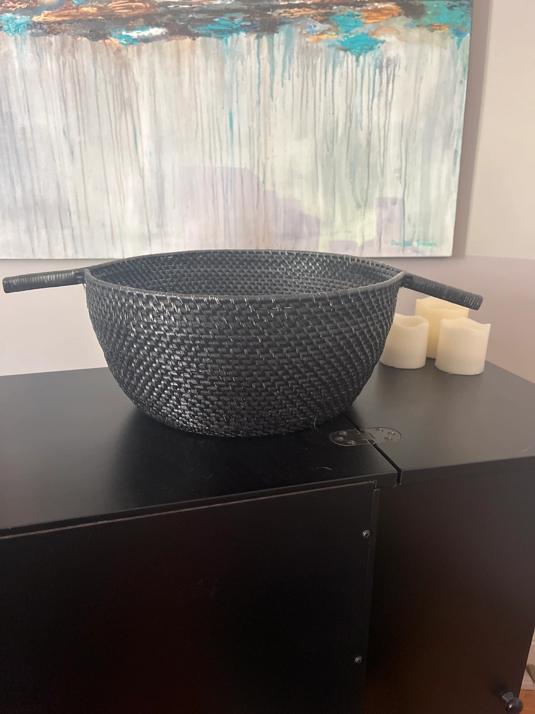 Large black woven basket. Two handles. Perfect for storage or display.