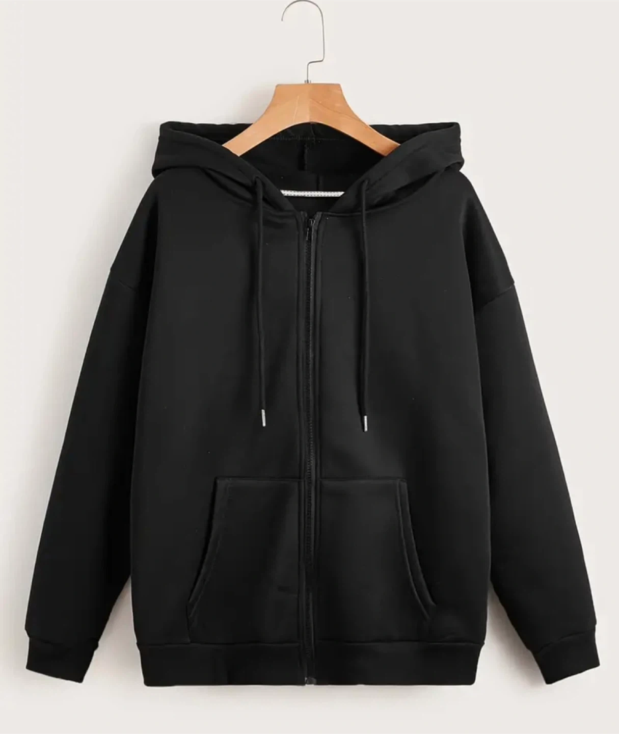 Selling a comfy black zip-up hoodie! It's in great condition and perfect for layering or just lounging around. The hoodie has a classic design with a front zipper and a hood with drawstrings. It also has a convenient front pocket. The material is soft and cozy, making it ideal for everyday wear