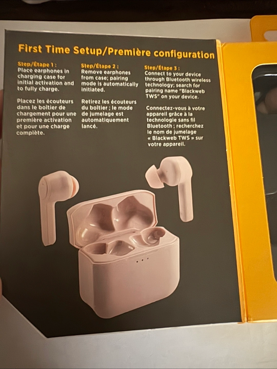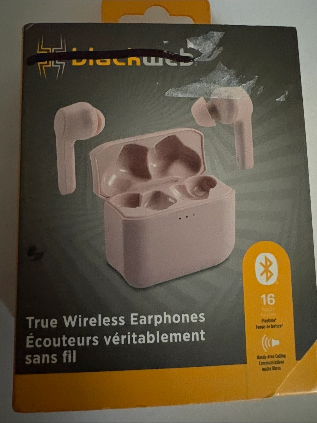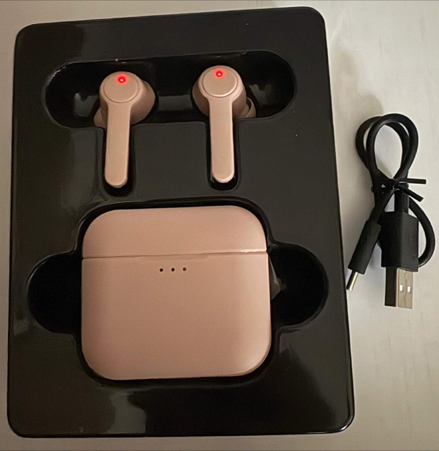 Brand new, unopened blush pink true wireless earphones. Includes charging case and USB charging cable. Bluetooth connectivity. Long playtime. Cash only