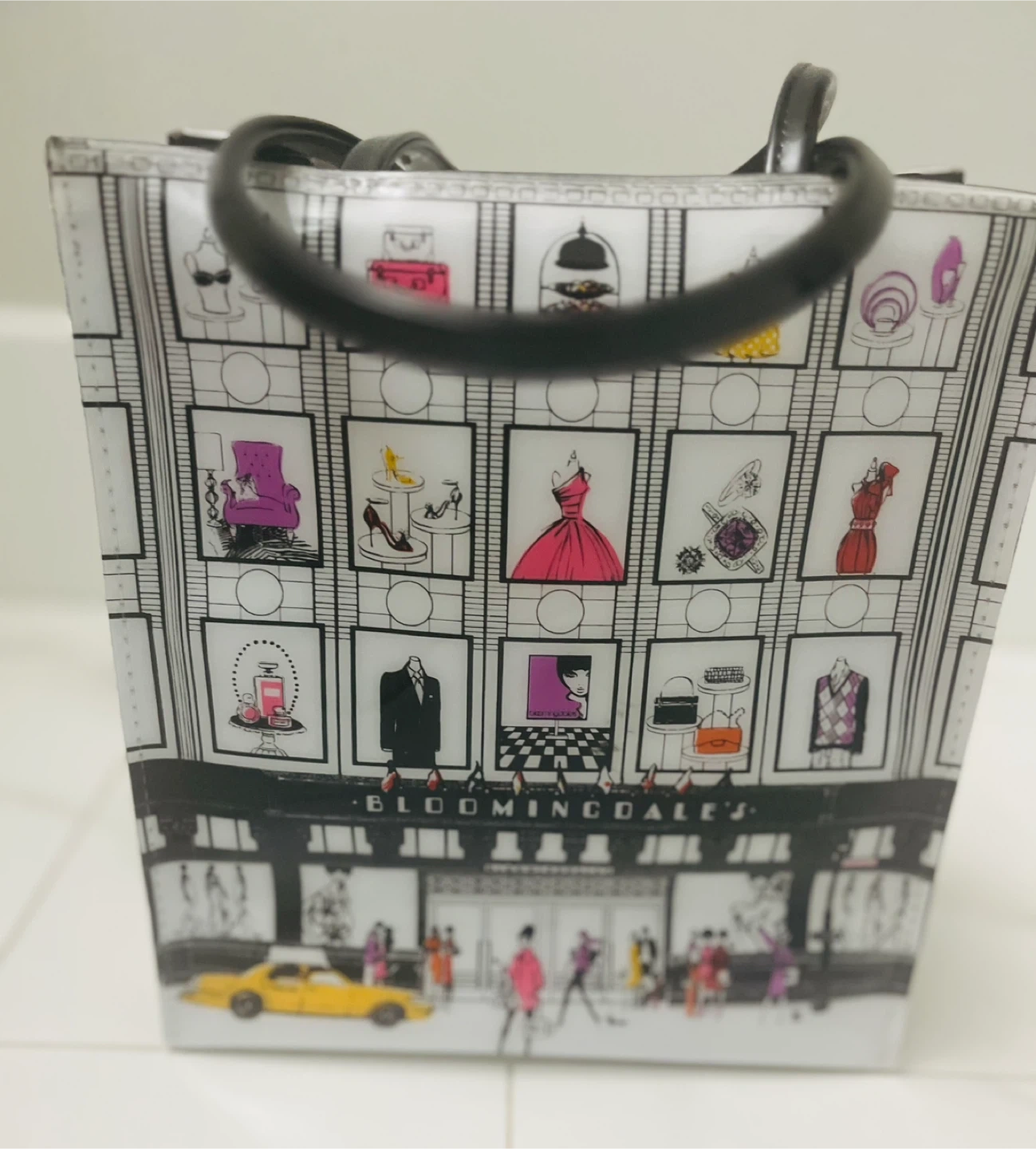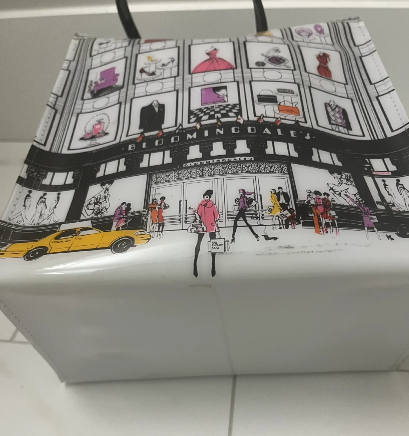 Here's a cute Bloomingdale's tote bag! It's got a fun design featuring different items and a vintage-style storefront. Perfect for carrying your essentials around town!
