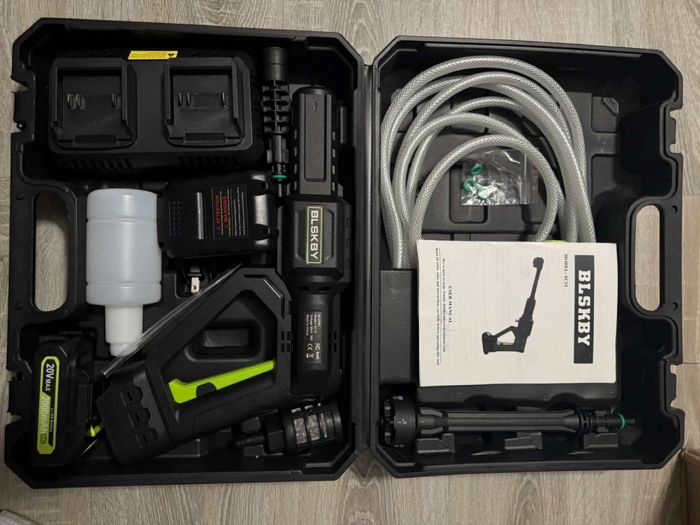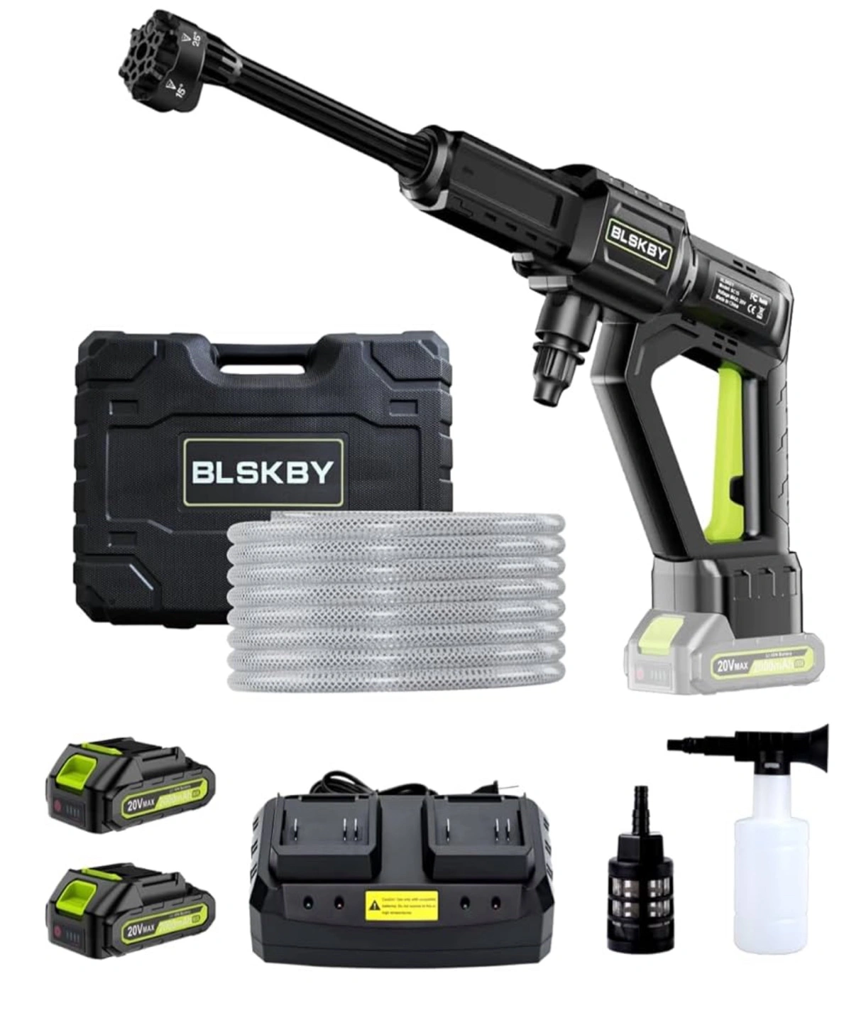 This power washer is sure to make cleaning feel a little easier. Includes charger, two batteries, and a soap dispenser.