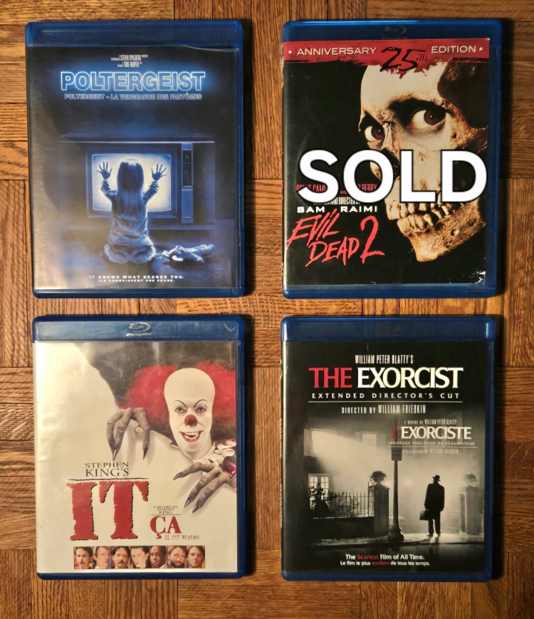Blu-ray Classic Horror Movies #1. Poltergeist (1982) American supernatural horror film directed by Tobe Hooper and written by Steven Spielberg. ** SOLD ** #2. Evil Dead II (1987) is a blend of horror and dark comedy, often described as a black comedy-horror film. 25th Anniversary Edition #3. It (1990) Psychological horror drama, featuring a predatory monster that exploits the phobias of its victims. #4. The Exorcist is a supernatural horror film, released in 1973. This blu-ray has the Extended Director's Cut. All 4 movies are gently used, cases intact, and all disks are in mint condition with no scratches. $7 each OR $20 for the whole lot. Cash is preferable. Exact payment Only (No change) EMTs welcome. PICKUP Only, Weston area. Comes from a clean, bug free, smoke free, kitty friendly home. Willing to meet curbside. Pls check out my other Blu-ray listings. Stay tuned for more posting...