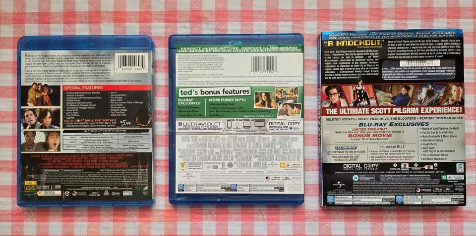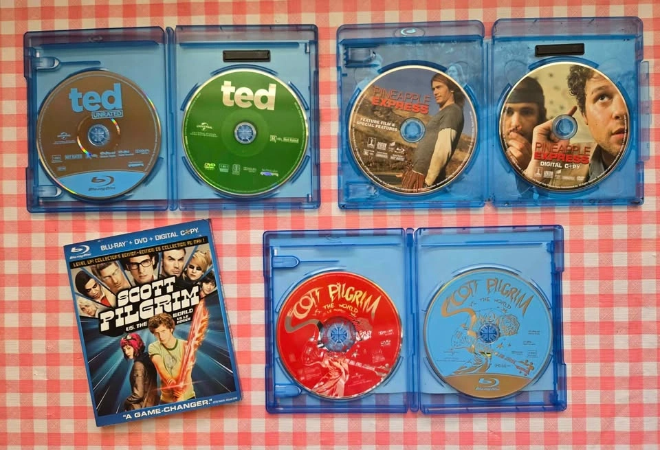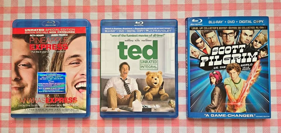 Blu-ray and DVD Format, Comedy Titles 3 for $12 "Pineapple Express" - 2008 American buddy stoner action comedy Theatrical/extended versions - unrated + special edition Disk #1 Blu-ray format + Special features Disk #2 DVD format "ted" - 2010 American fantasy buddy comedy film. Disk #1 Unrated/theatrical versions Disk #2 DVD format "Scott Pilgrim vs. the World" - 2010 romantic action comedy film, based on the graphic novel series Scott Pilgrim by Bryan Lee O'Malley. 2 disks - Blu-ray + DVD formats. All 3 movies are gently used, cases and jackets intact. All disks are in mint condition with no scratches. Asking $12 for the lot. No holds. Cash is preferable. Exact payment Only (No change) EMTs welcome. PICKUP Only, Weston area. Comes from a clean, bug free, smoke free, kitty friendly home. Willing to meet curbside. Feel free to message if you have any questions!