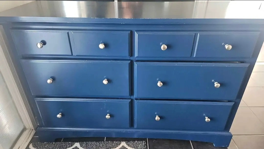 Selling a sturdy blue dresser with 8 drawers. It's in good condition and would be a great addition to any bedroom or living space. The drawers slide smoothly. A great piece for extra storage!