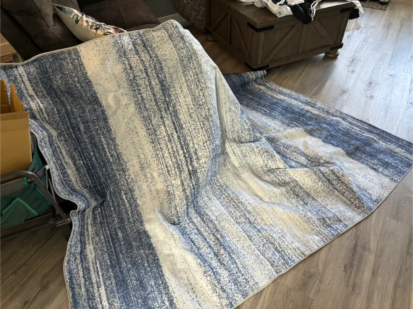 Area rug with a blue and white pattern. Brand new condition. Never used