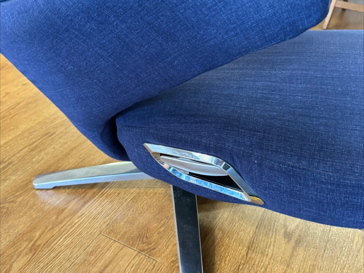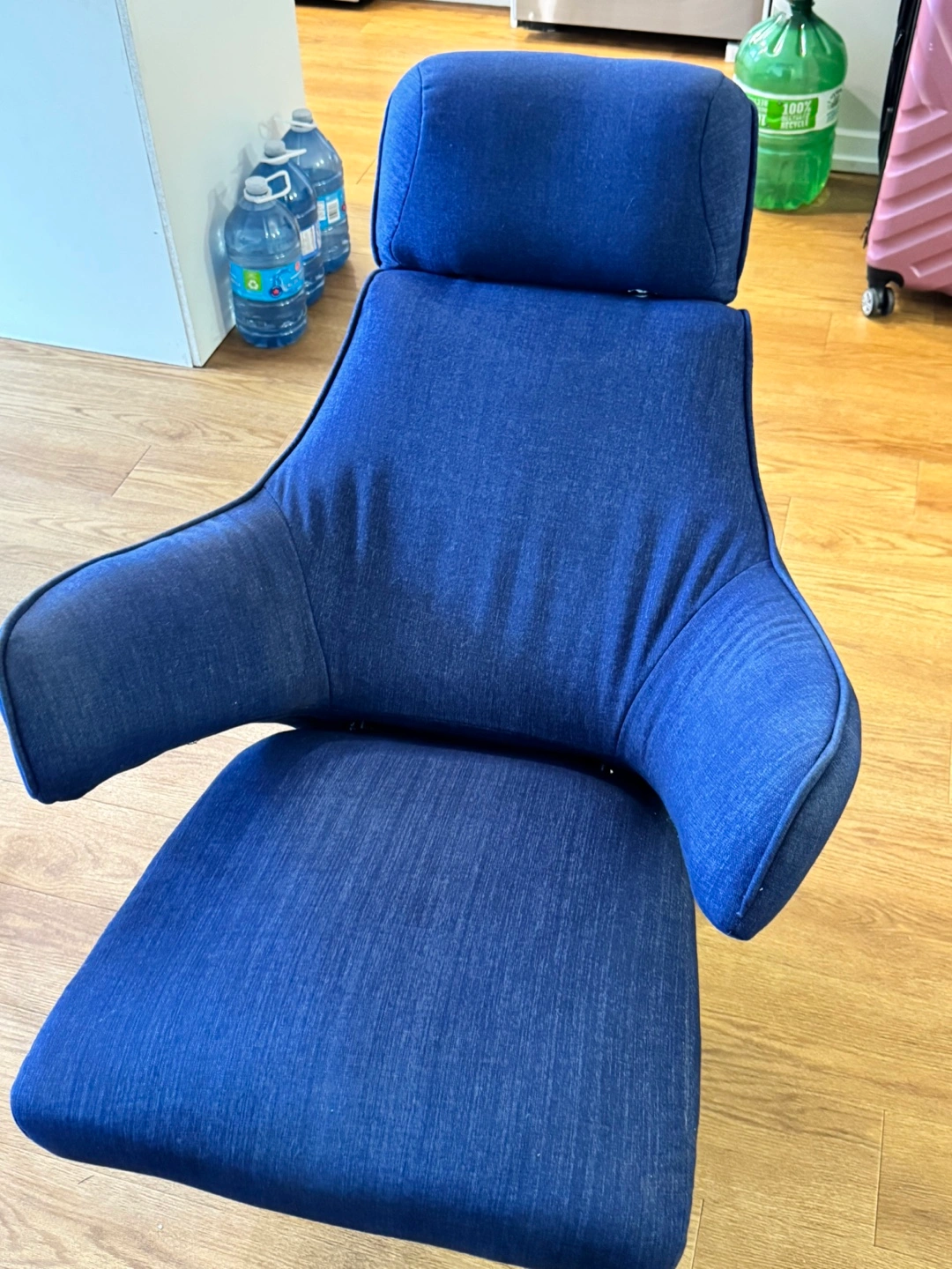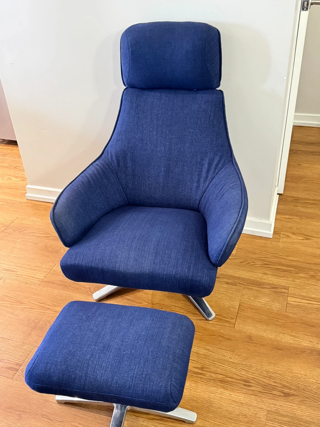 Selling a comfy blue armchair with a matching ottoman! It's in great shape and perfect for relaxing after a long day. The chair features a high back and armrests for extra support. The ottoman is a great addition to kick your feet up! It would be great in any living room or bedroom