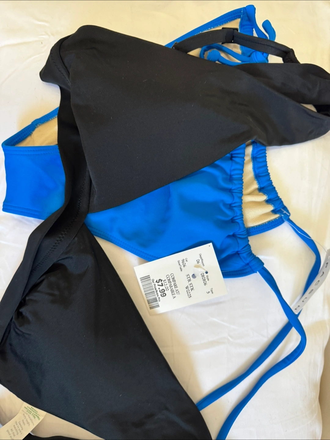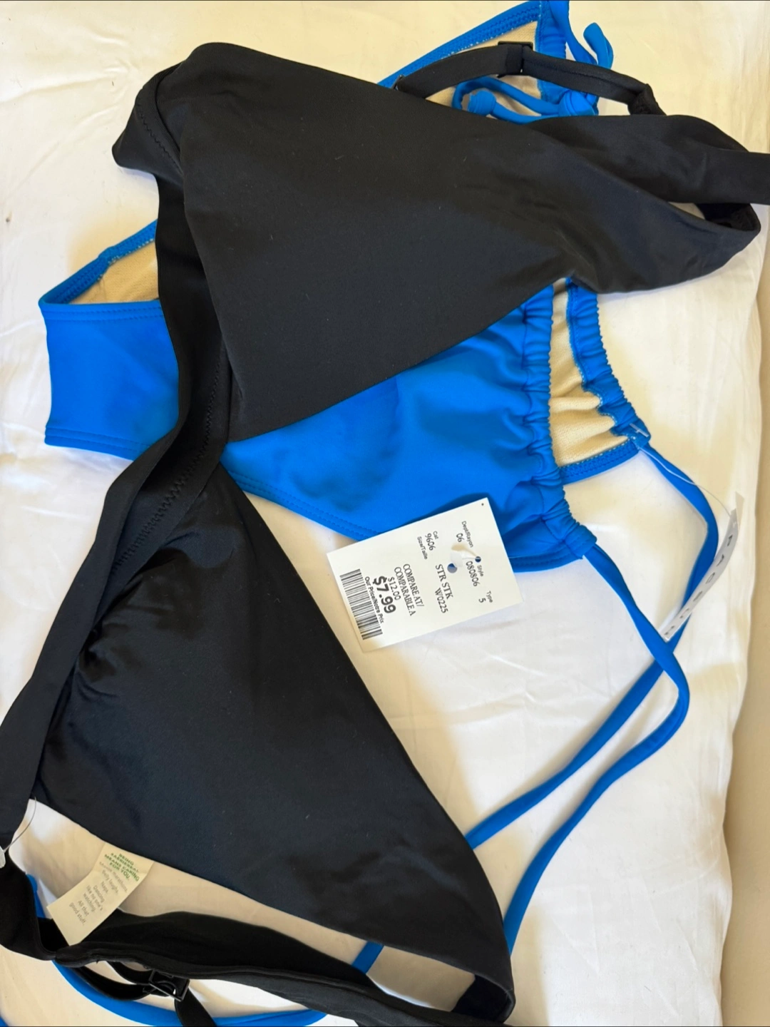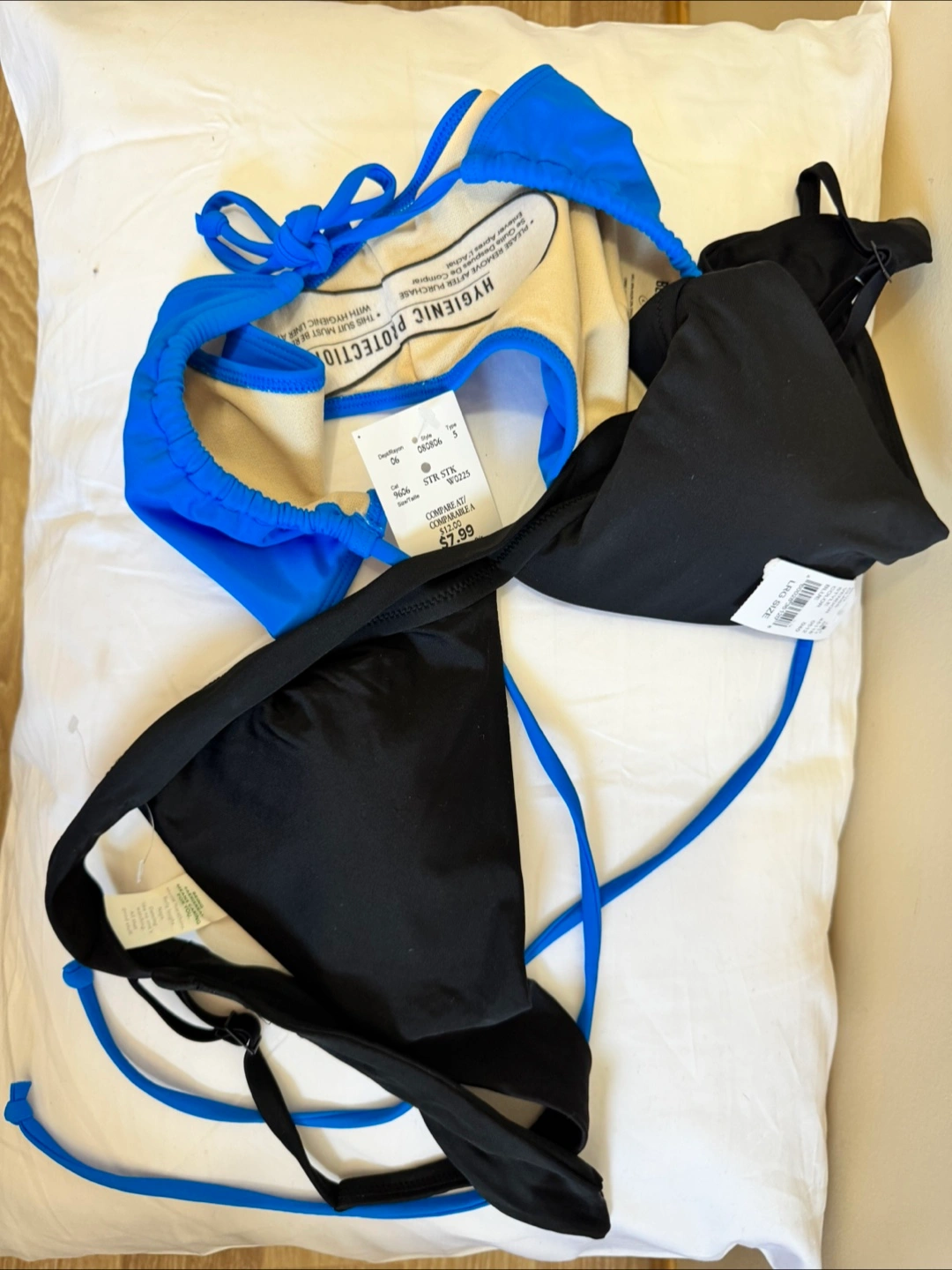 Selling a cute bikini set in blue and black. The size is large. It's in great condition and ready for some fun in the sun