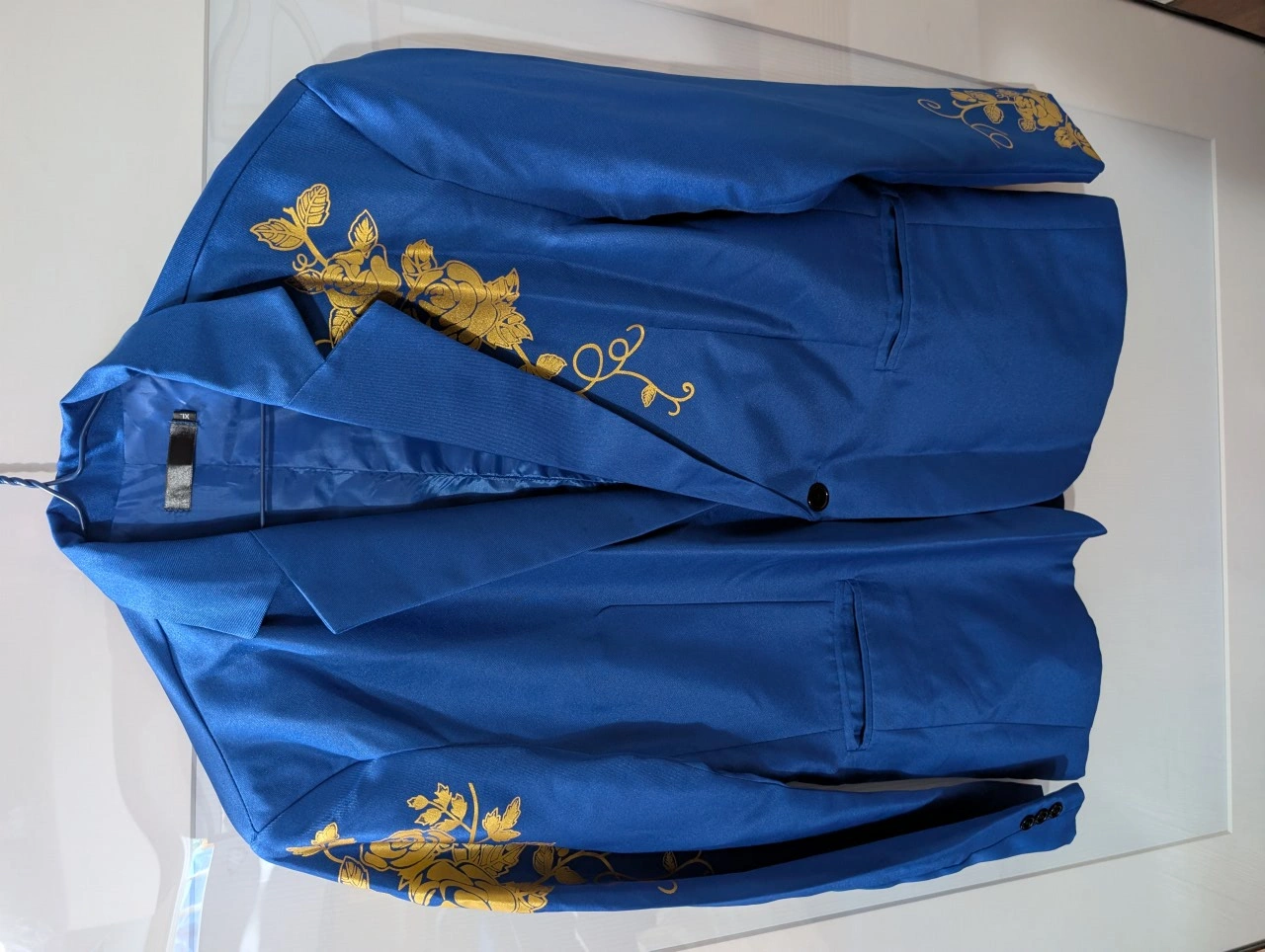 Selling a blue blazer in size XL. It features gold floral designs on the front and sleeves. Never worn as it was the wrong size.