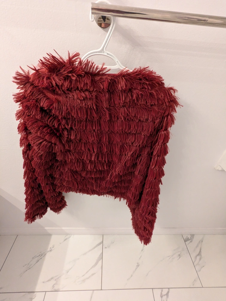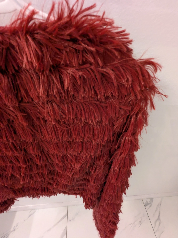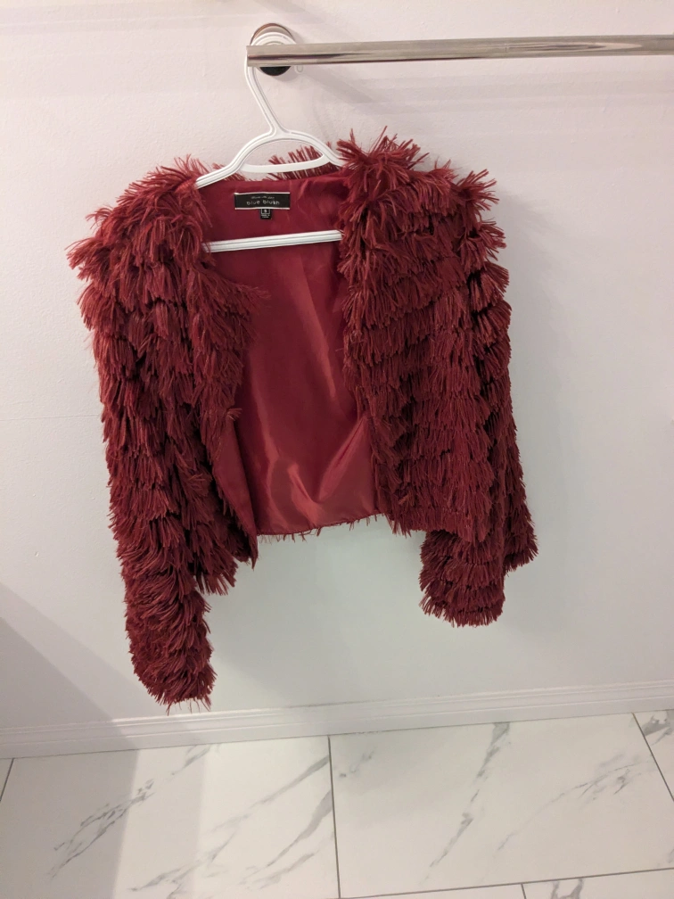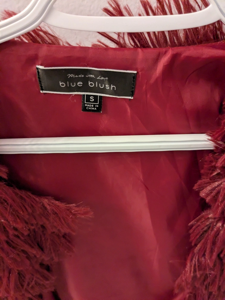 Cozy up in this stylish Blue Blush faux fur jacket! It's a size small and perfect for adding a touch of texture to any outfit. The jacket is a beautiful burgundy colour and is in great condition