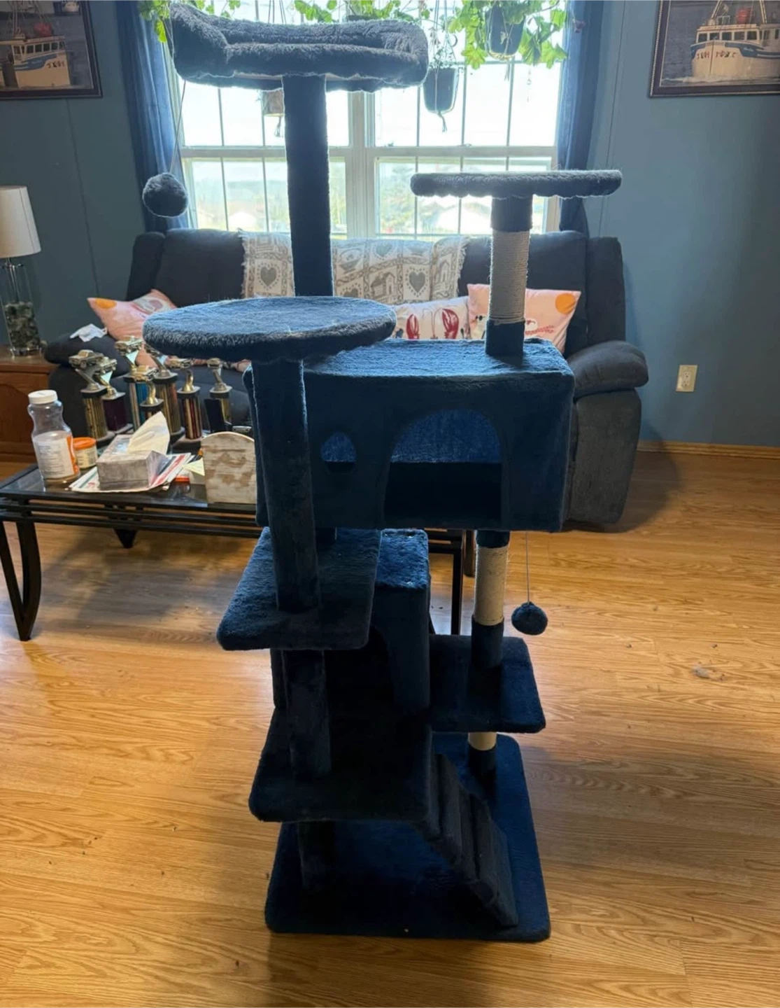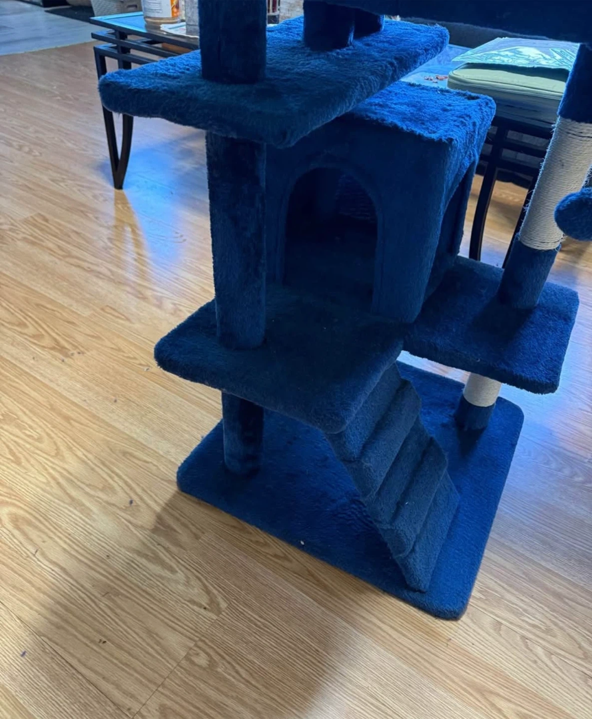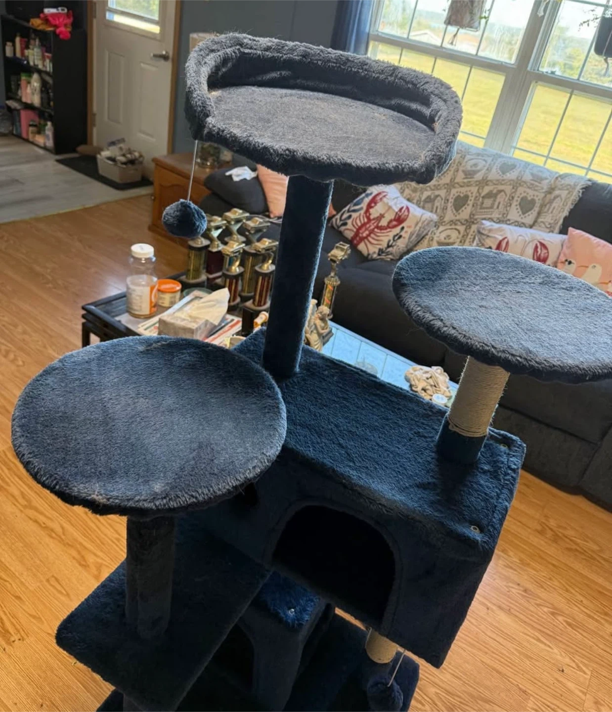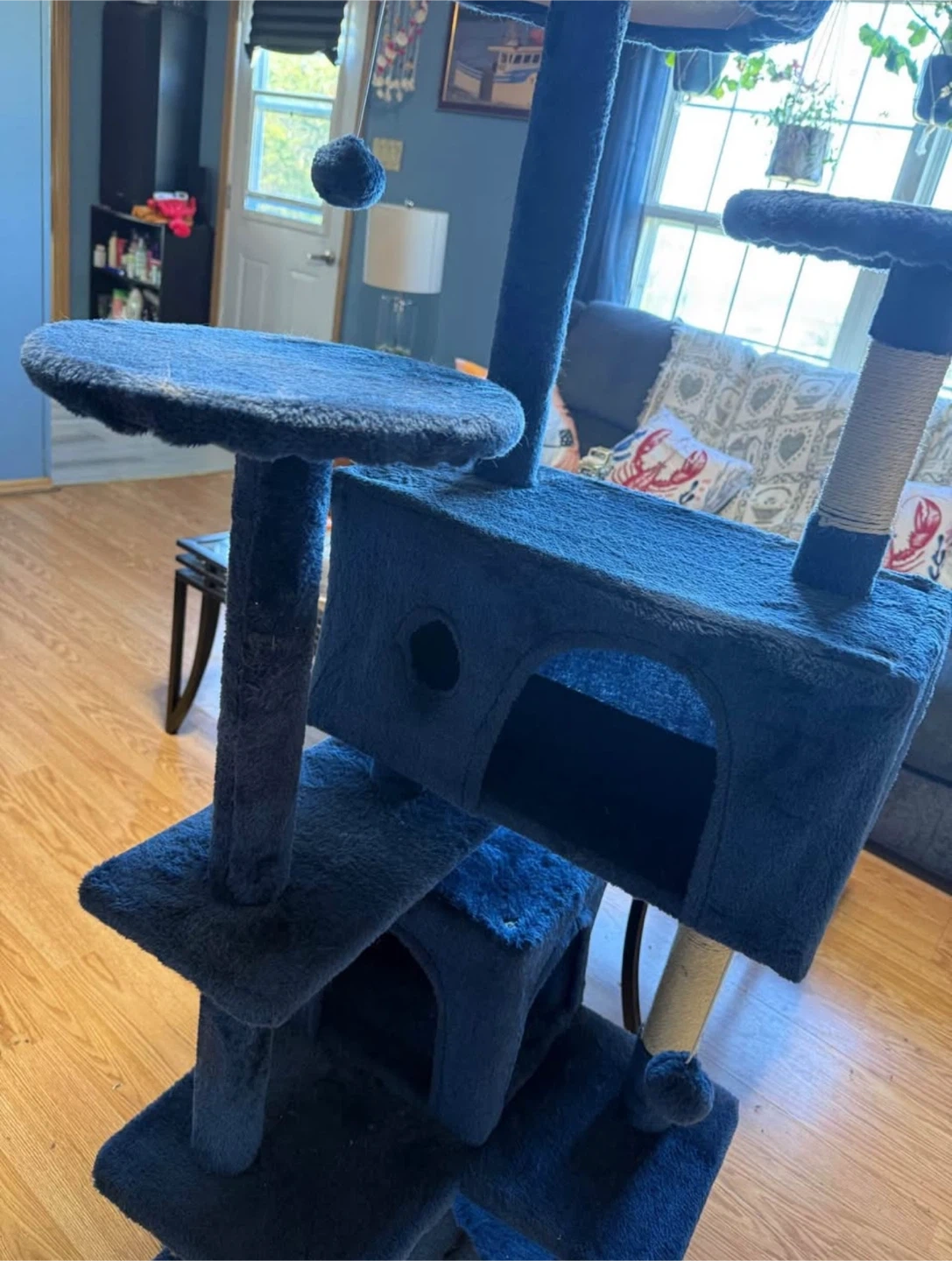 Selling a blue cat tree! It's in great shape and has multiple levels for your cat to explore. It also includes scratching posts to keep your kitty's claws healthy and your furniture safe. Perfect for any cat looking for a fun and engaging place to play and relax