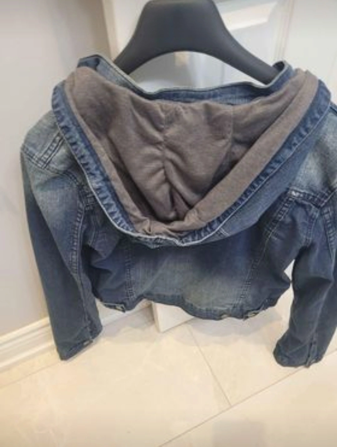 Blue denim jacket with a grey hooded lining. Button closure. Long sleeves.