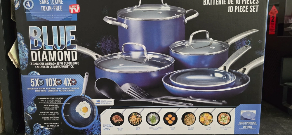 Selling a brand new Blue Diamond 10-piece cookware set! This set features enhanced ceramic nonstick and is toxin-free. It's oven and broiler safe, and dishwasher safe for easy cleanup. Great for any kitchen or anyone moving out on their for the first time!