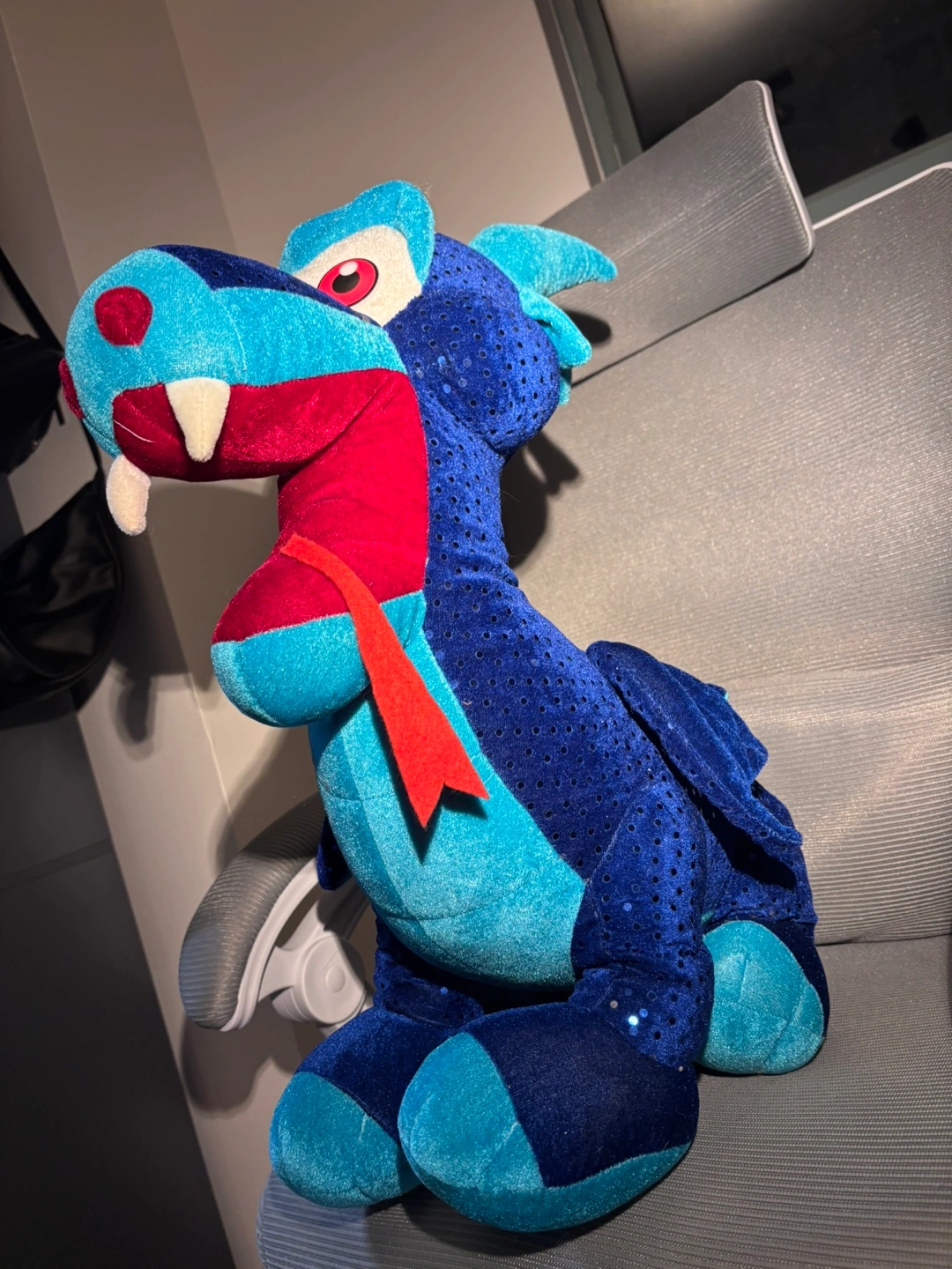 A bright blue dragon plush. It features a two-tone head. Sequins cover its body. Dragons can make for a great night time companion. Great for young kids! π Price is negotiable :) π