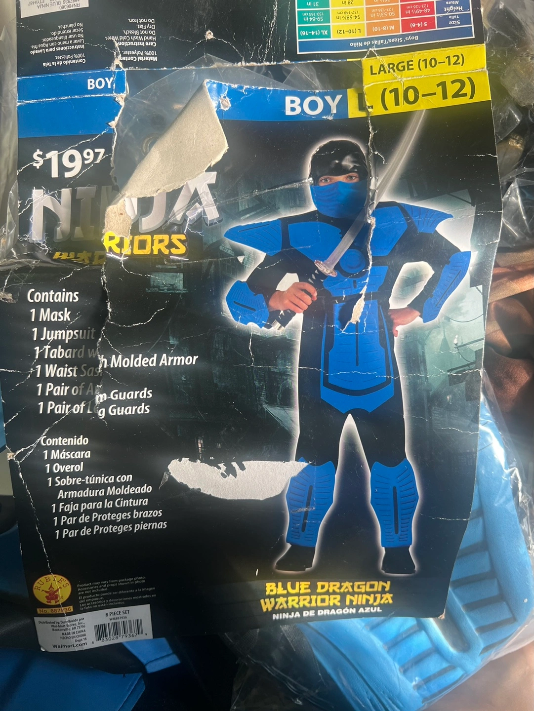 Get your little ninja ready for action with this Blue Dragon Warrior Ninja costume! It's a boy's size large (10-12). The costume includes: - 1 Mask - 1 Jumpsuit - 1 Tabard with Molded Armor - 1 Waist Sash - 1 Pair of Arm Guards - 1 Pair of Leg Guards Originally bought for $19.97