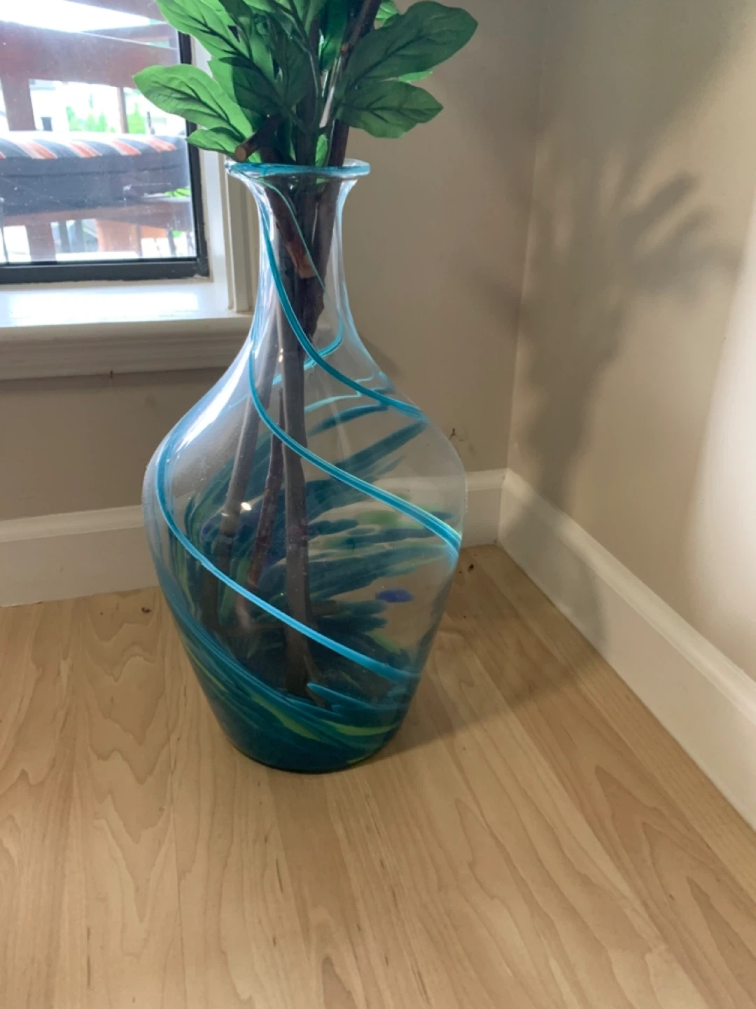 Beautiful floral arrangement! It features vibrant blue and white fabric flowers in a stylish glass vase with a unique swirl design. Perfect for brightening up any room! From smoke free, pet free home.