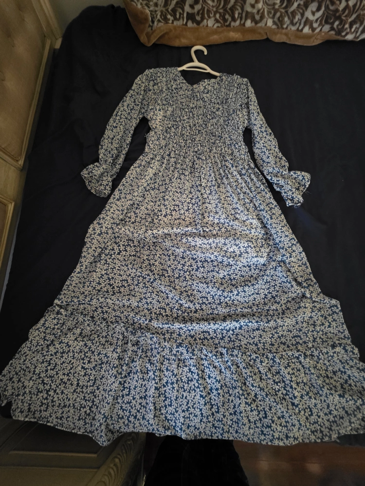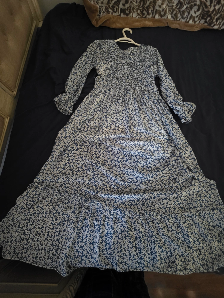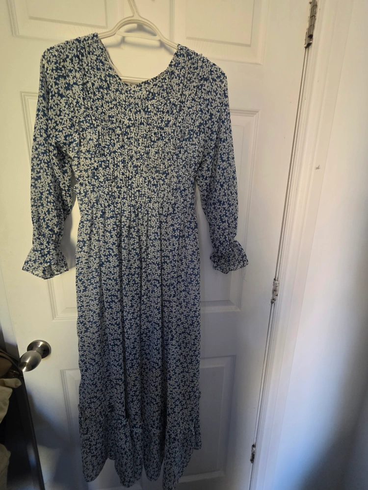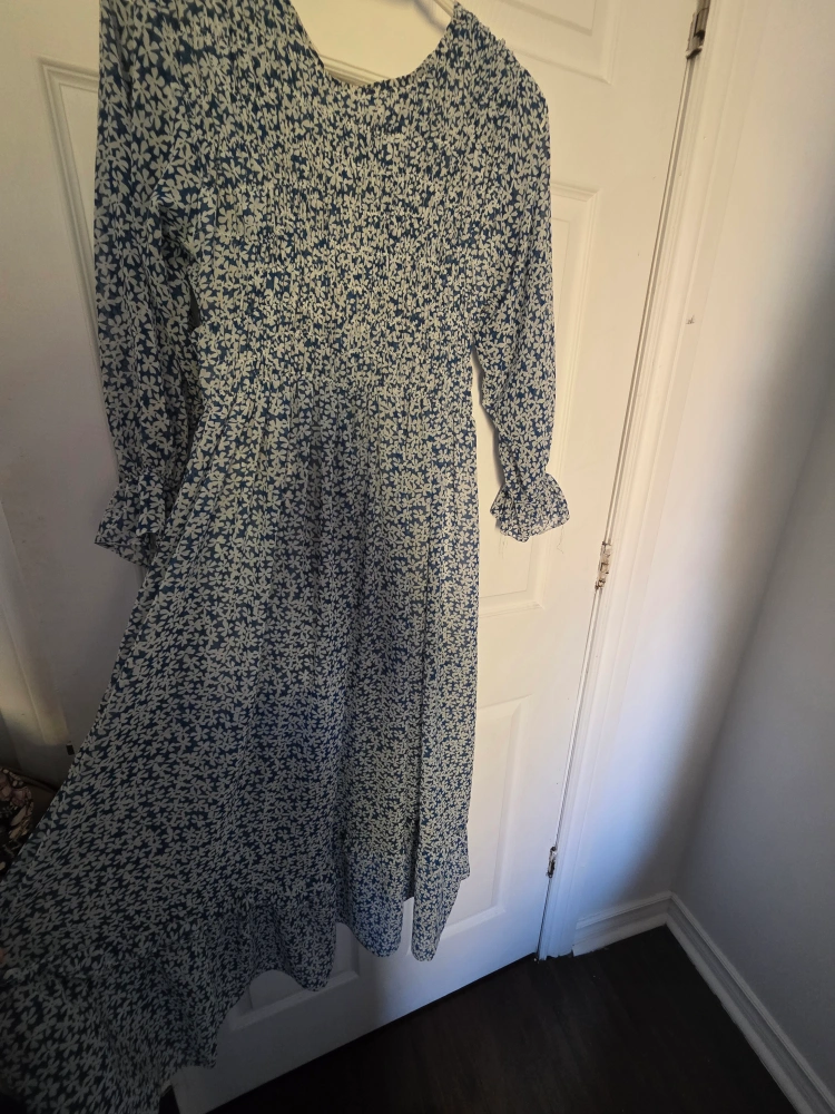 Selling a beautiful blue and white floral print maxi dress! It features long sleeves with ruffled cuffs and a shirred bodice. Perfect for a casual day out or a special occasion