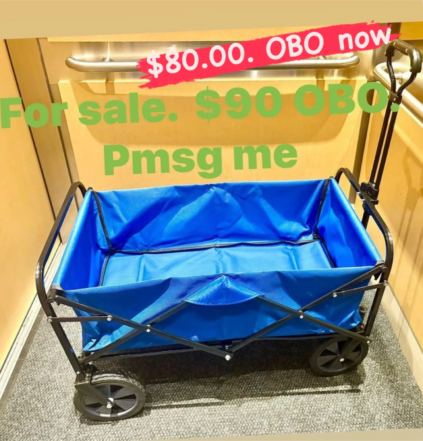 Selling a blue folding wagon. It's UNUSED, in the box and in good condition and ready for your next adventure or chore! Folds up for easy storage. Locking handle. 24lbs. Original price for one was $96.00 incl taxes. I mistakenly bought 2 wagons online. To get a refund from Best Buy marketplace requires a $45 shipping cost by me! So I am selling it here on Karrot. It makes a nice gift for someone else too as it is still in the box, brand new:)