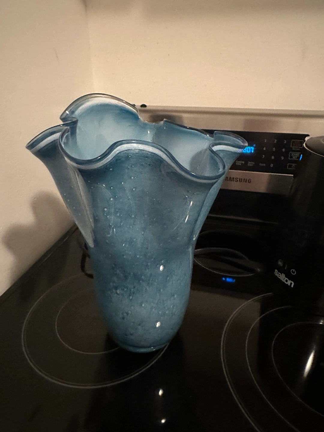 Blue glass vase with a ruffled top. It has a cloudy, almost frosted look.$20 I bought at winners but realized it was to big