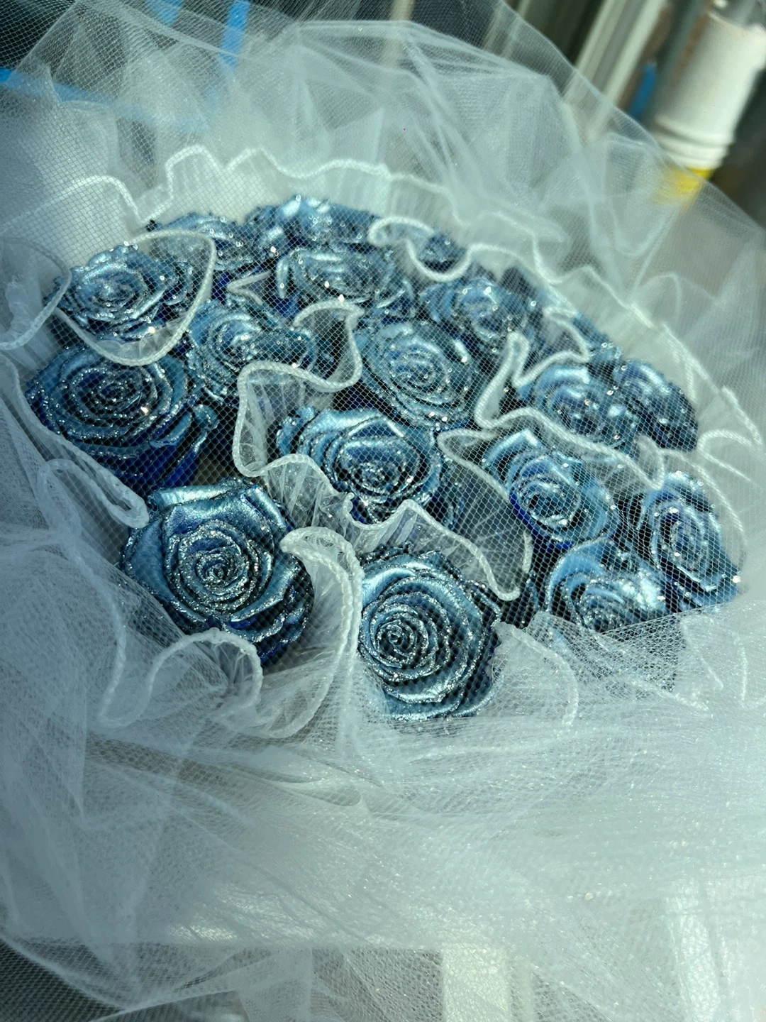 Beautiful 18 blue glittered rose bouquet, perfect for a special occasion or as a unique decorative piece! It's wrapped in white tulle and tied with a ribbon, ready to be displayed