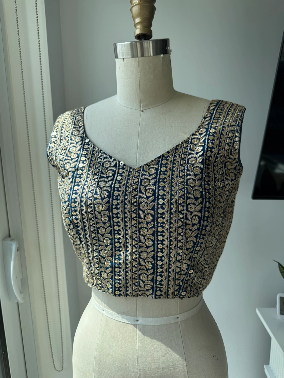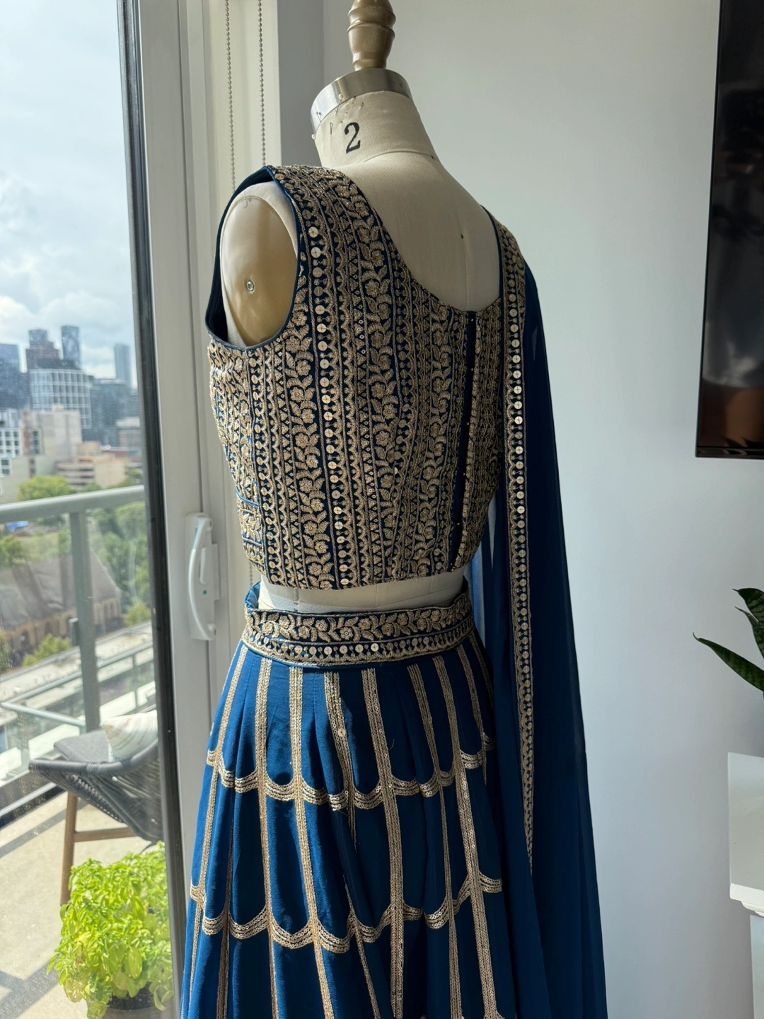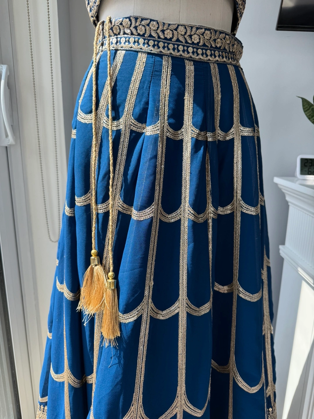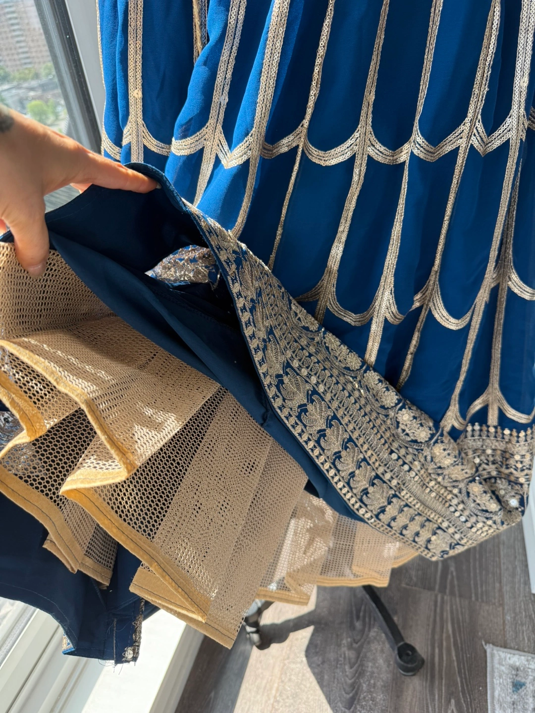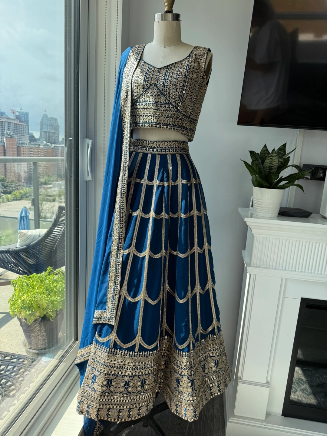 Worn once. Comes with an extra blouse. Beautiful blue and gold lehenga. Perfect for a special occasion! The intricate detailing and vibrant colours make it a stunning outfit.