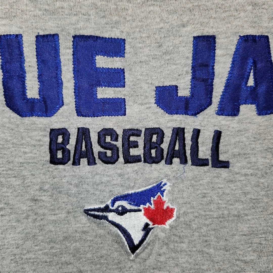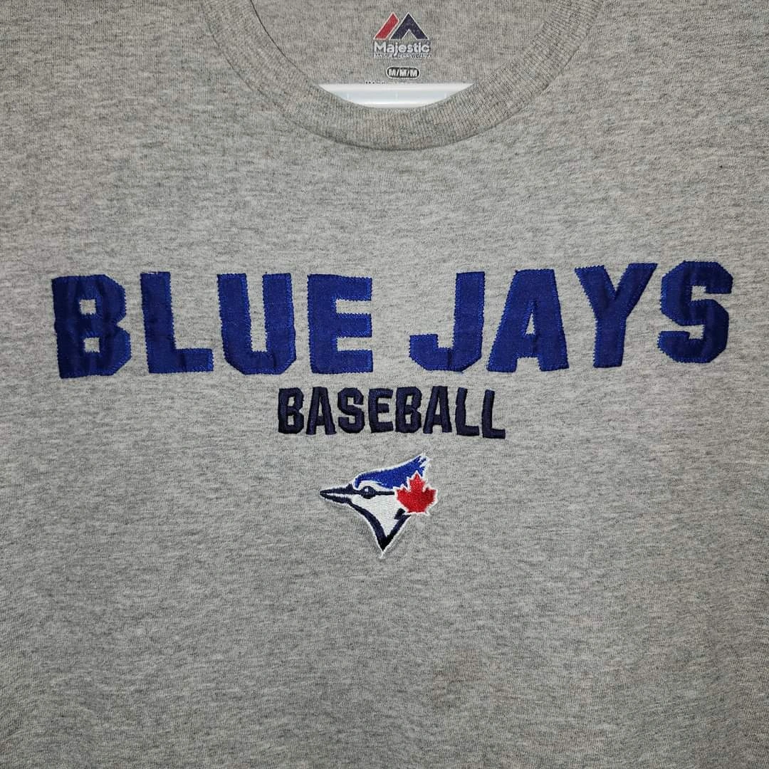 $17. BLUE JAYS T-SHIRT by Majestic. #M #Medium Gender Neutral Fit. Gray T- Shirt. EUC. EMBROIDERED. LOGO. & *BASEBALL*. *BLUE JAYS* LETTERS ARE sewn on with Fabric. Sorry for wrinkles. Pit to Pit 20". Hem across 21". Length 26' Smoke & Pet Free Home. Danforth & Victoria Park Ave. 🌞 Please check my other posts. Doing a massive wardrobe clearout from sizes XS to XXL