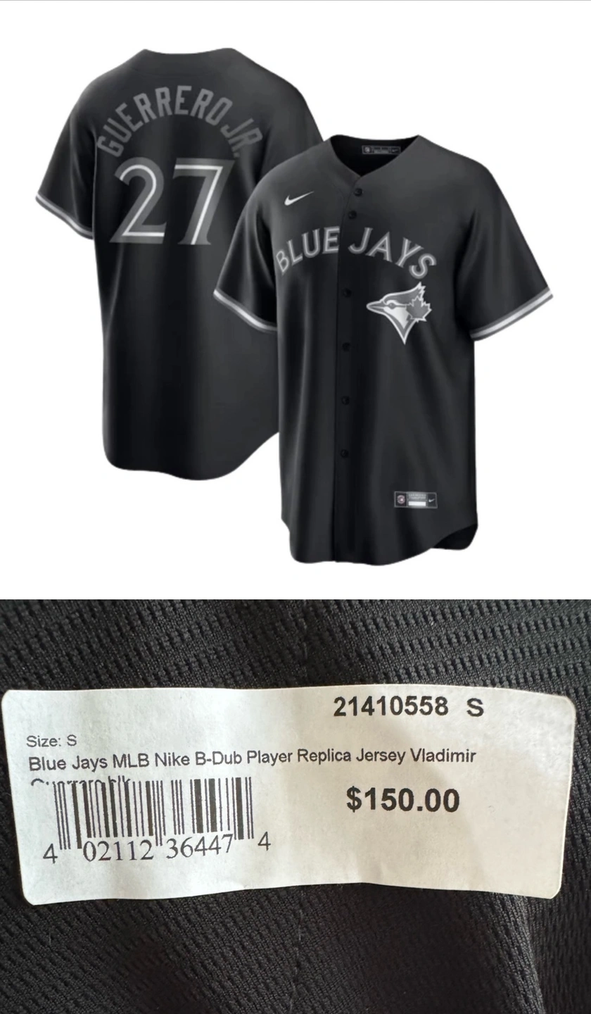 Nike B-Dub Player Replica Jersey in size S. Black jersey with grey accents. The black and white design is the perfect change of pace from the typical Toronto Blue Jays jersey and makes the graphics stand out even more. Featuring a full-button front, this is just what you want to wear to the ballpark. Officially licensed.