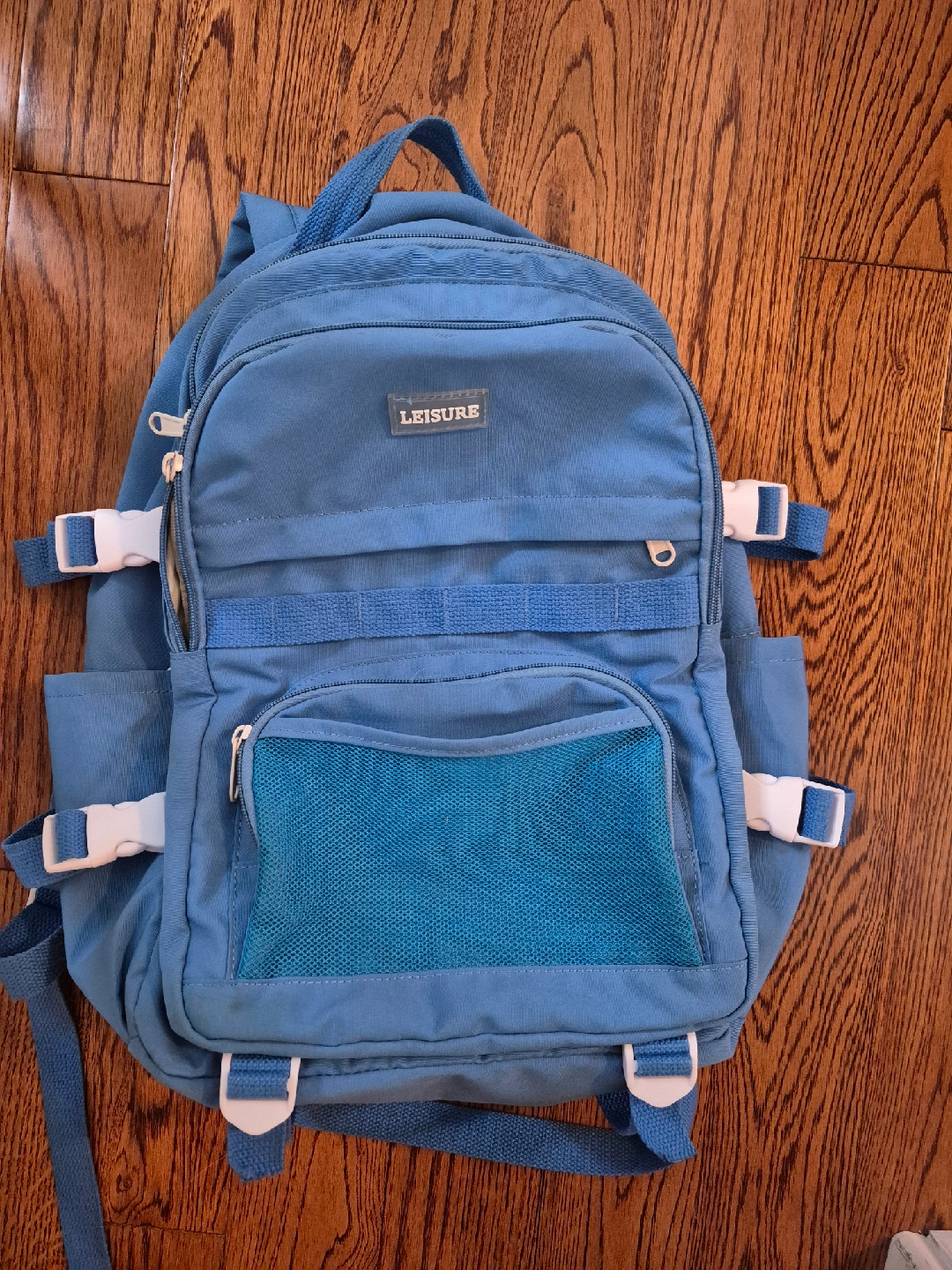A cute blue Leisure backpack, perfect for kids or anyone who likes a smaller bag! It's in great shape and ready for a new adventure