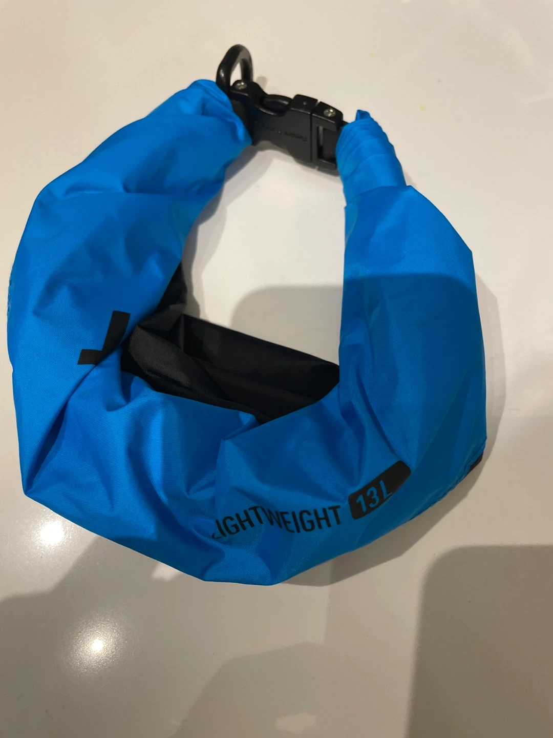 Selling a bright blue dry bag, perfect for keeping your belongings safe and dry! It's lightweight and has a 13L capacity, making it ideal for various outdoor activities. It appears to be in great condition and ready for its next adventure