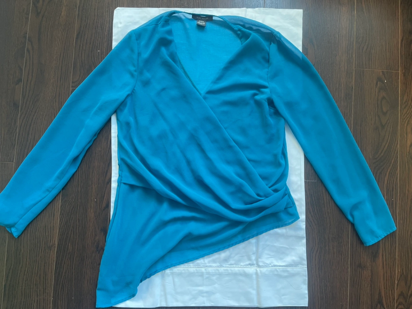 Long sleeve blue blouse with V-neck. Asymmetrical hemline.