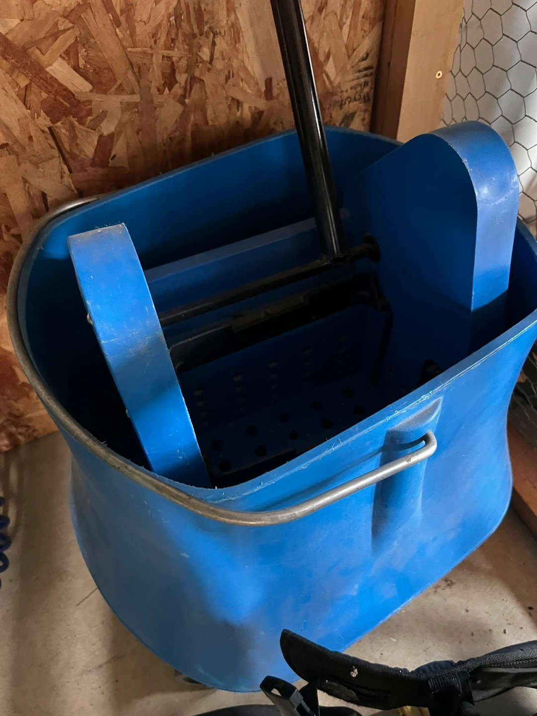 Selling a sturdy blue mop bucket with a built-in wringer! It's in good condition and ready to help you keep your floors sparkling clean