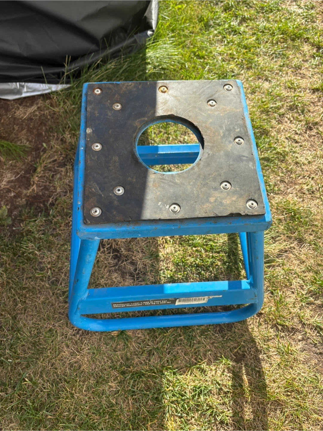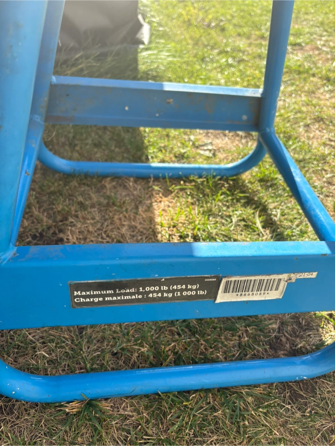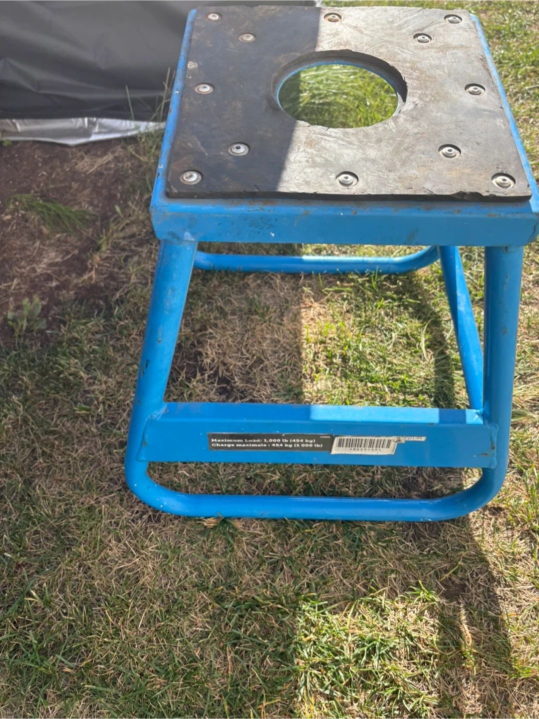 Selling a sturdy blue motorcycle stand! It has a maximum load capacity of 1,000 lb (454 kg). Perfect for any motorcycle enthusiast needing a reliable stand