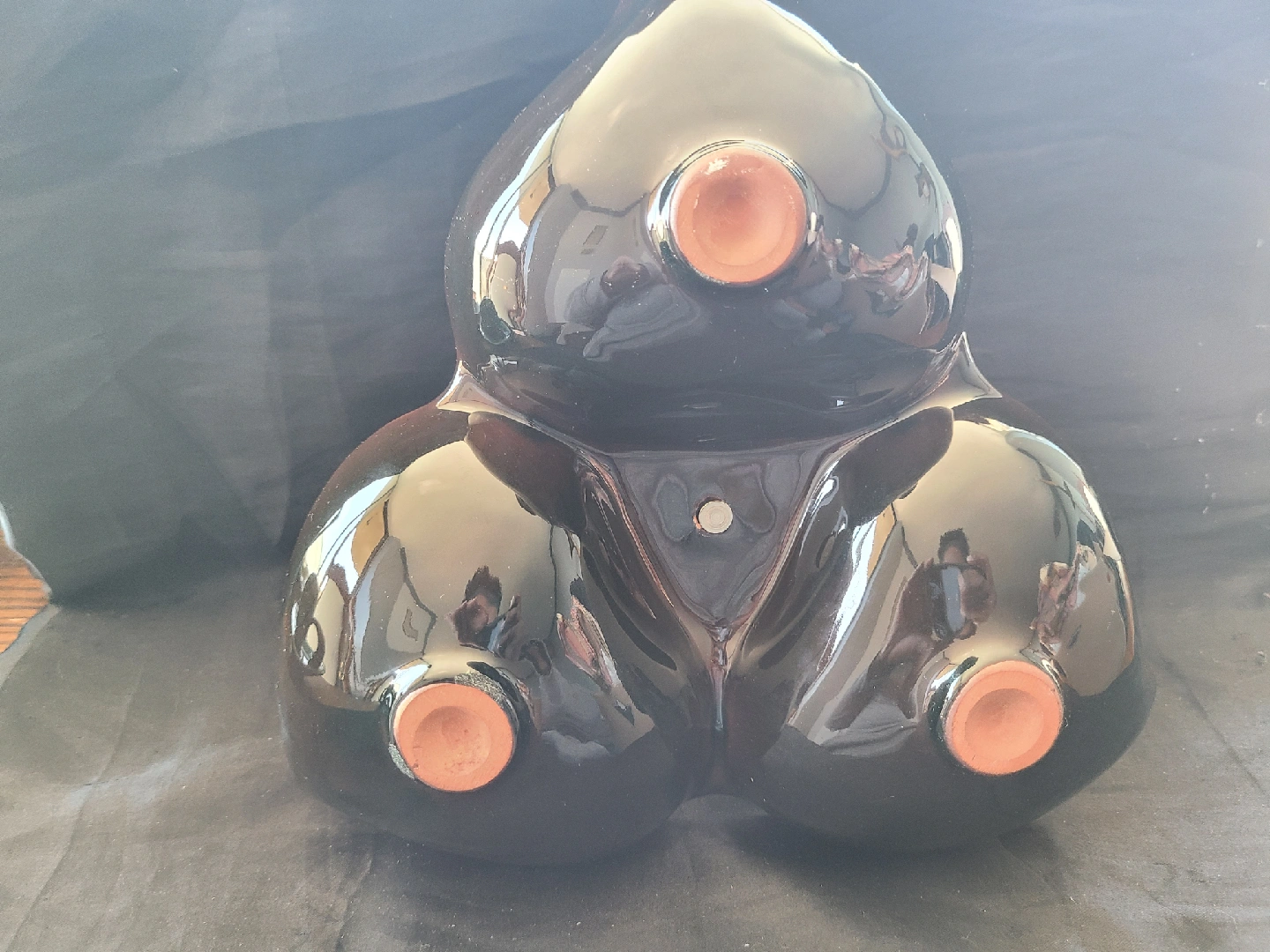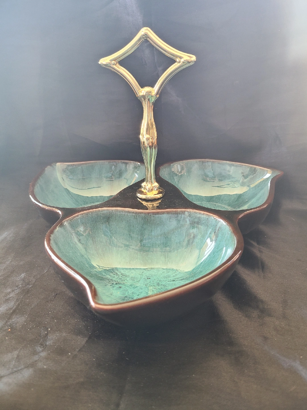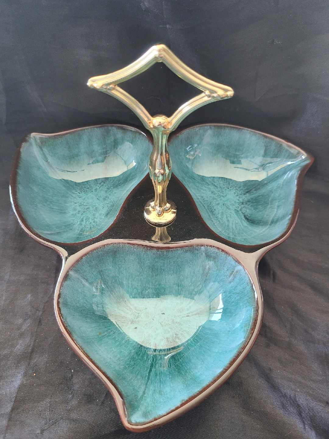 ceramic serving dish! It features three teal-coloured bowls arranged around a central gold-tone handle. It would be perfect for serving snacks or appetizers at your next gathering, or as a decorative piece