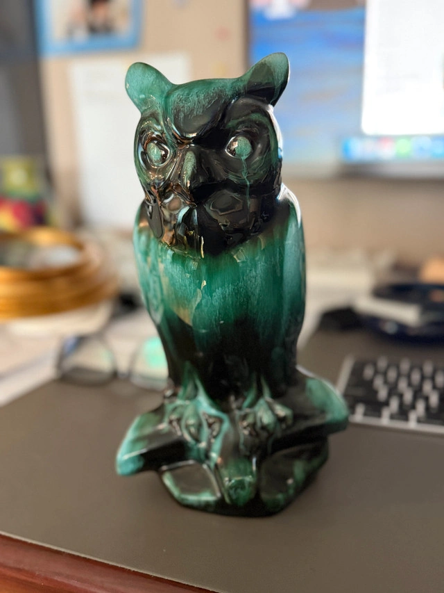 This beautiful Blue Mountain Pottery owl figurine is a stunning piece of Canadian art pottery, featuring the distinctive green and brown glaze that Blue Mountain Pottery is known for. In good condition, with no visible chips or cracks, this vintage owl stands approximately 10 inches tall and would make a great addition to any collection or a unique decorative piece for your home. If the ad is still up, it's still available!