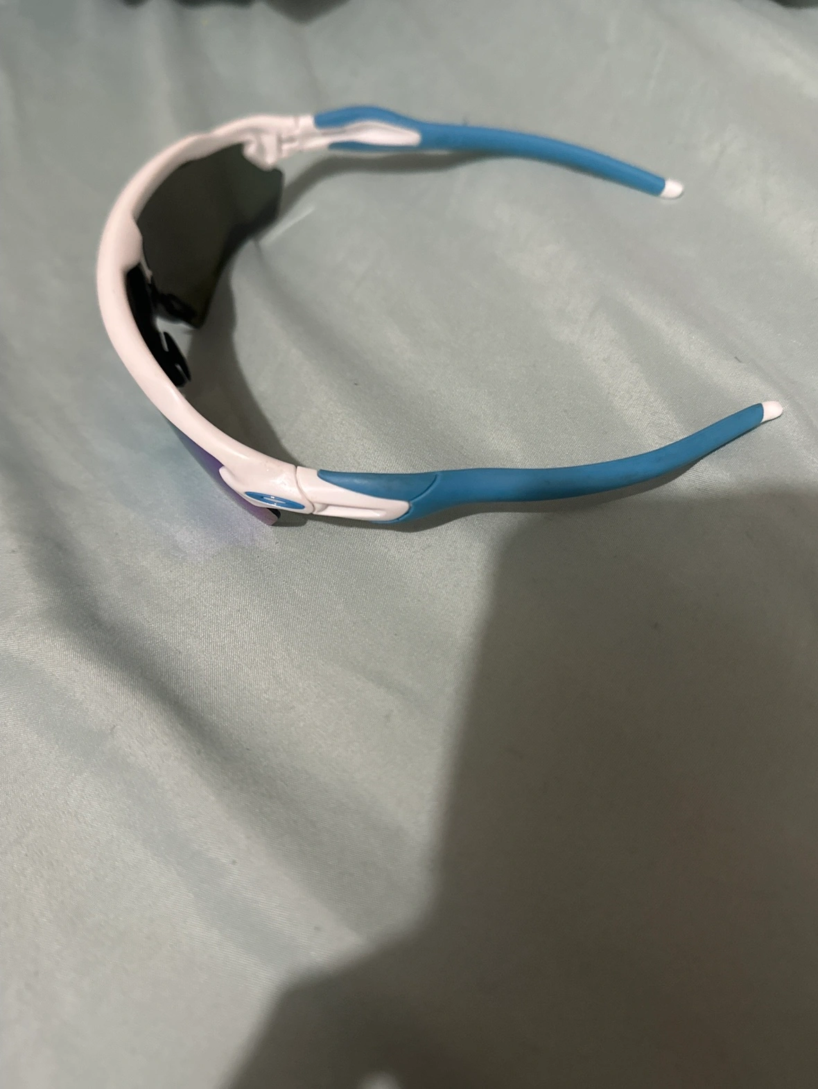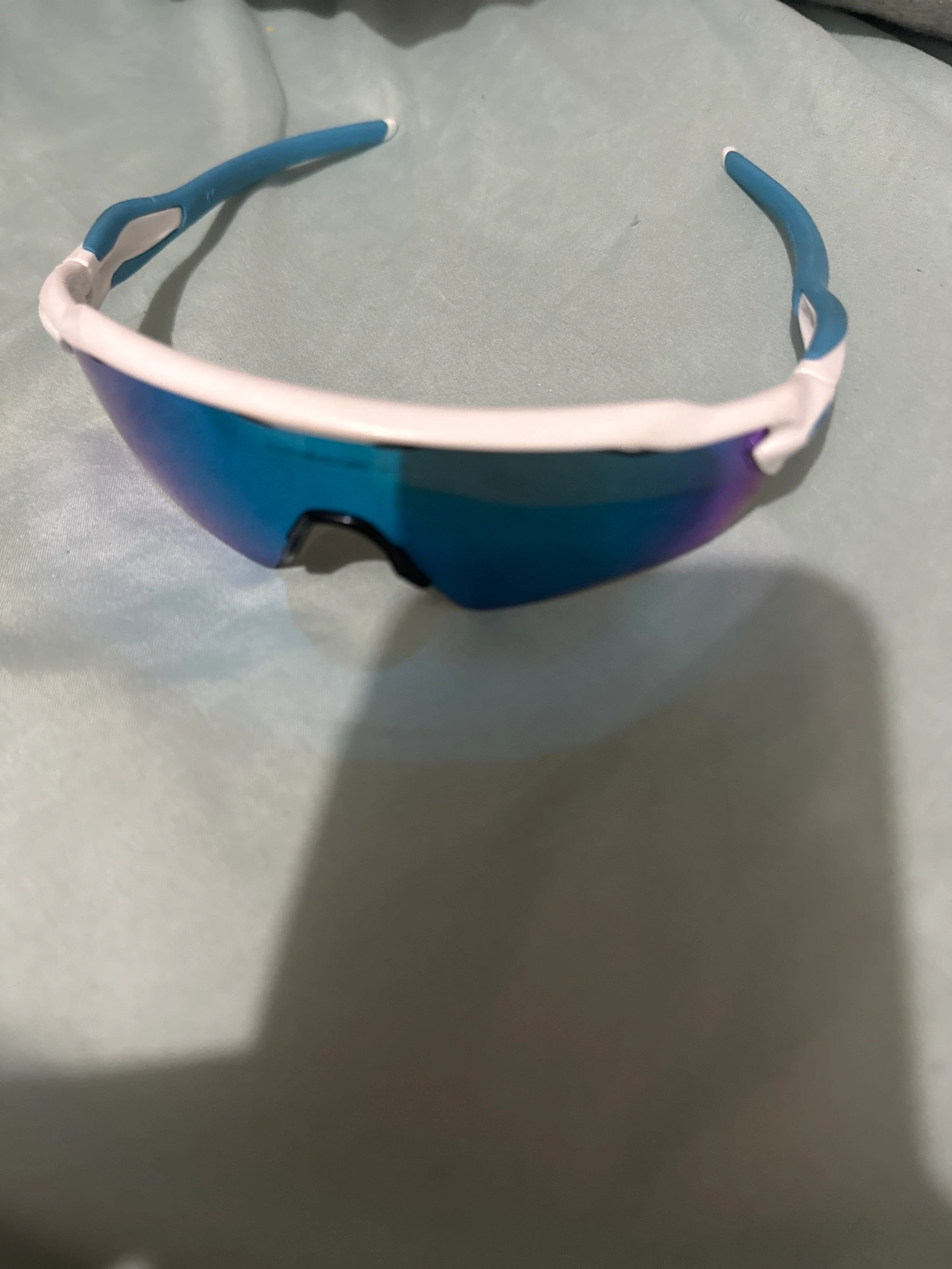 These Oakley sunglasses are white with blue arms and have a mirrored blue lens.Great for sports and it’s in new conditions.