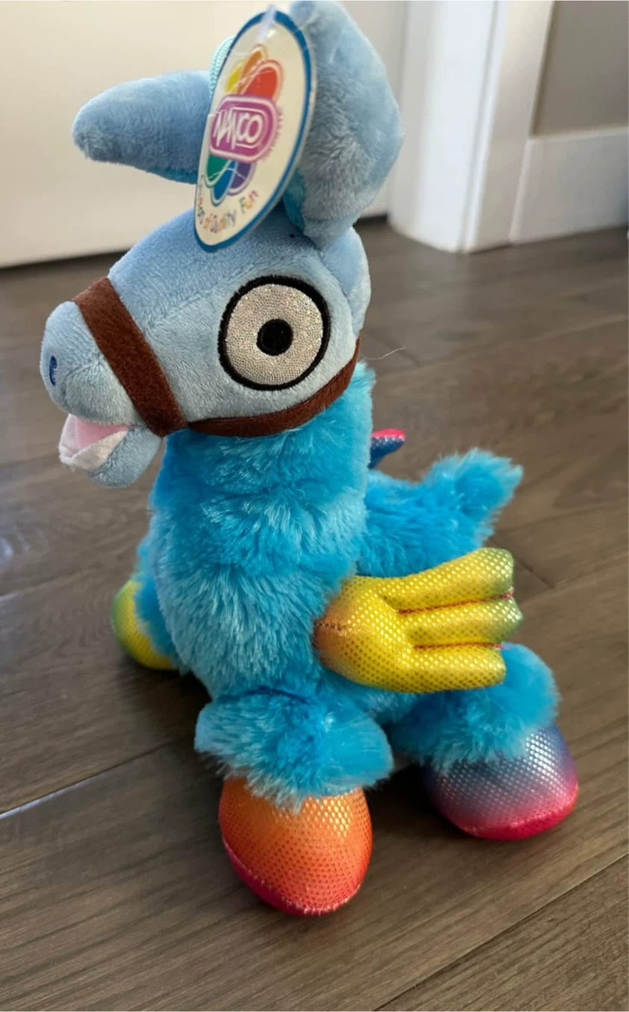 Selling a cute plush lama toy in a vibrant blue colour! It has some colourful accents on the hooves and wings, making it a fun and unique toy