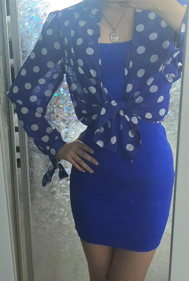 A cute blue polka dot blouse and bodycon dress! Perfect for adding a pop of colour to your wardrobe. Blouse is XS but will fit bigger and the dress fits XS but stretches. Price negotiable on bundles & open to trades. Delivery possible to most line 1 and line 2 stations.
