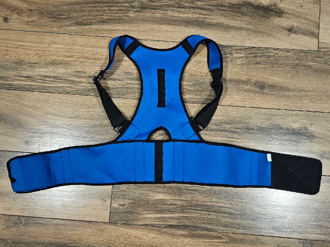 Here's an unused blue posture corrector It features adjustable straps and a comfortable design to help improve your posture throughout the day