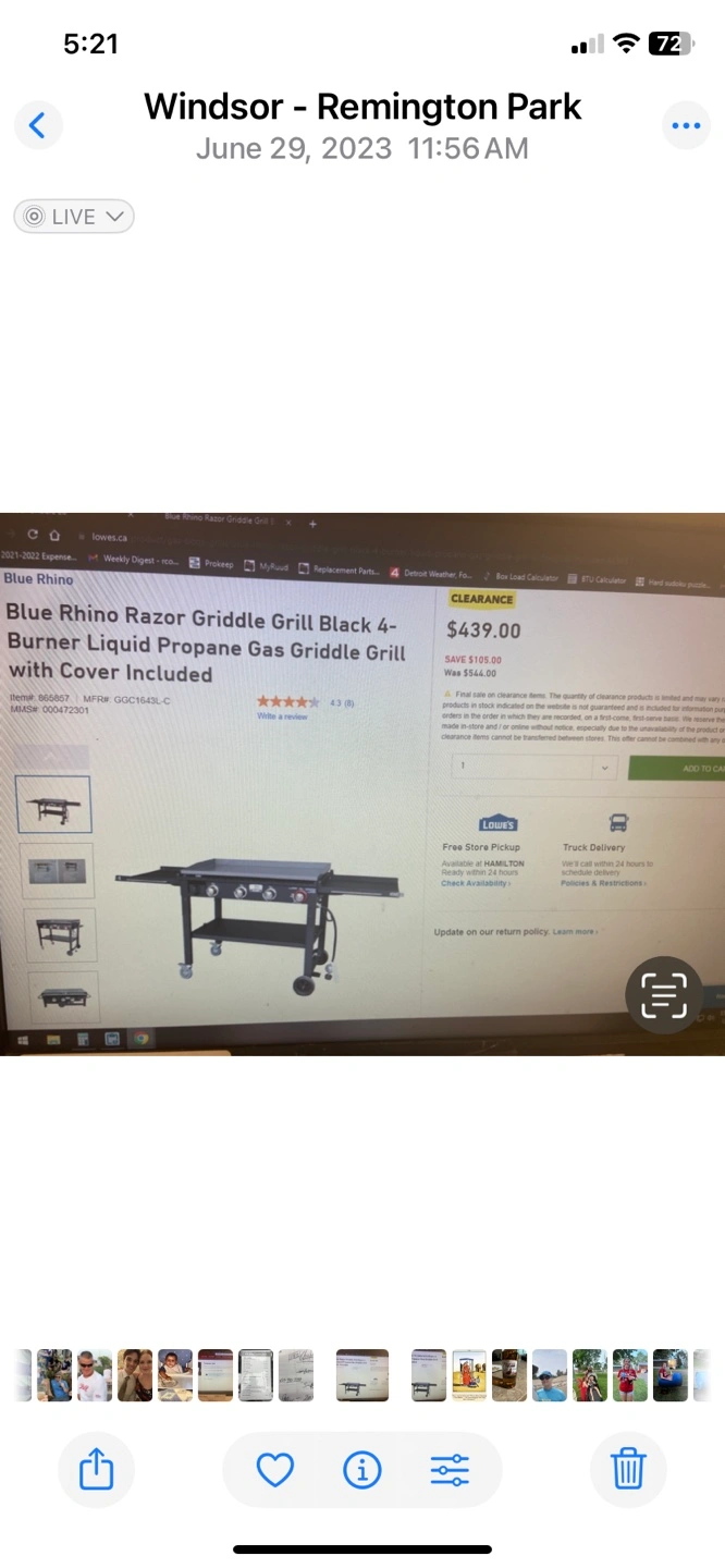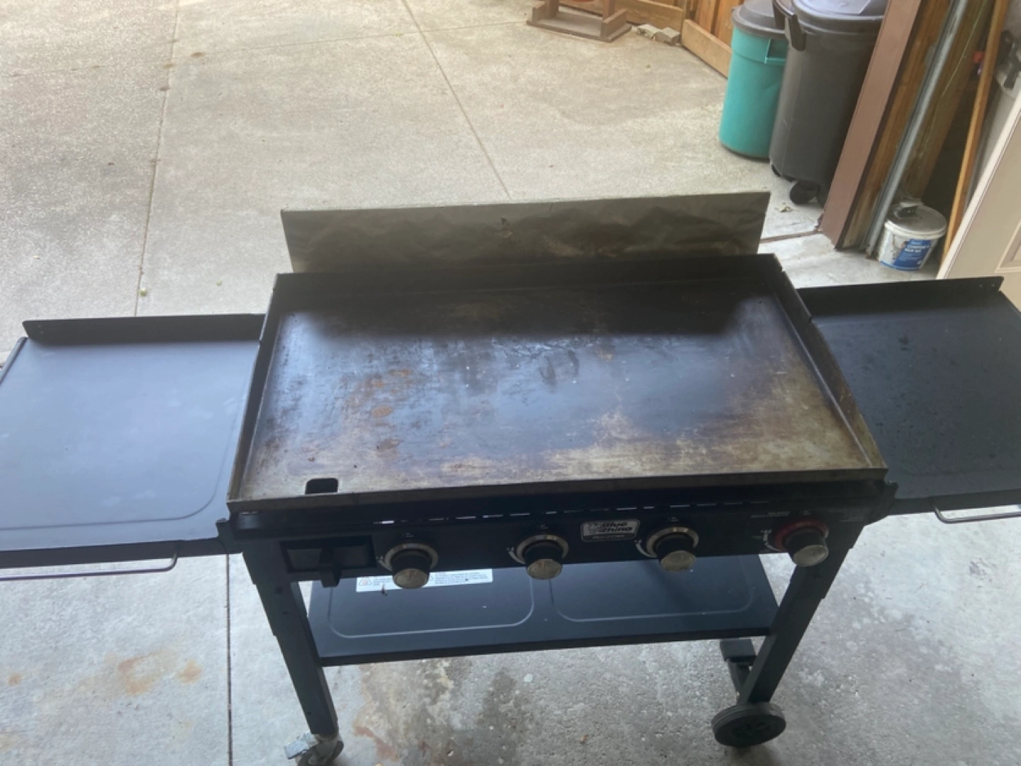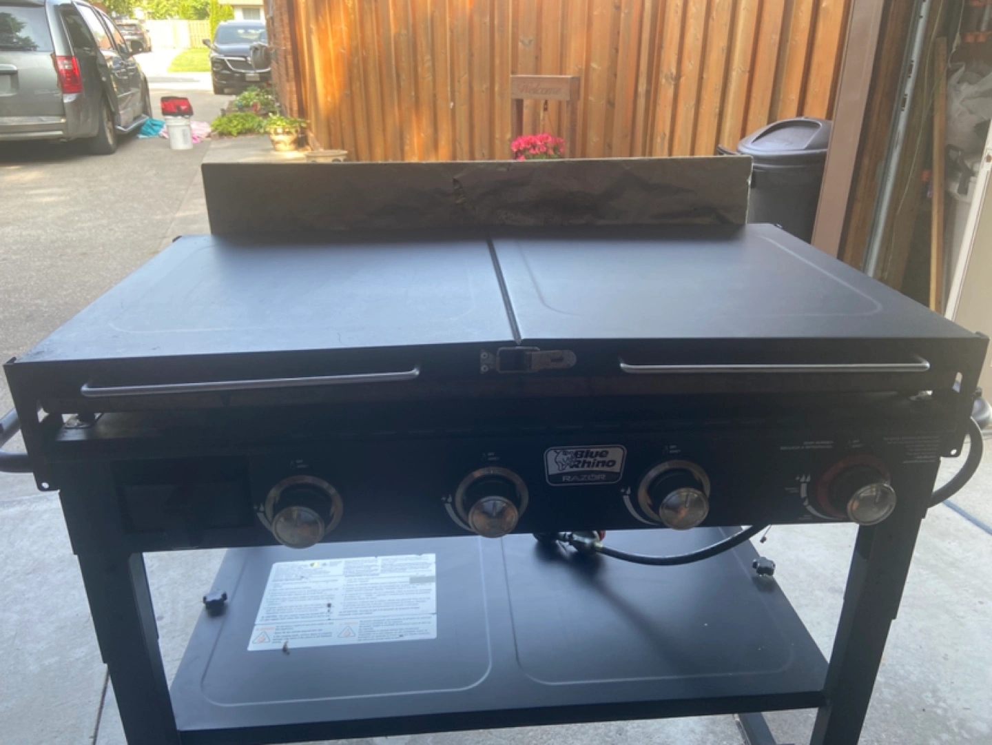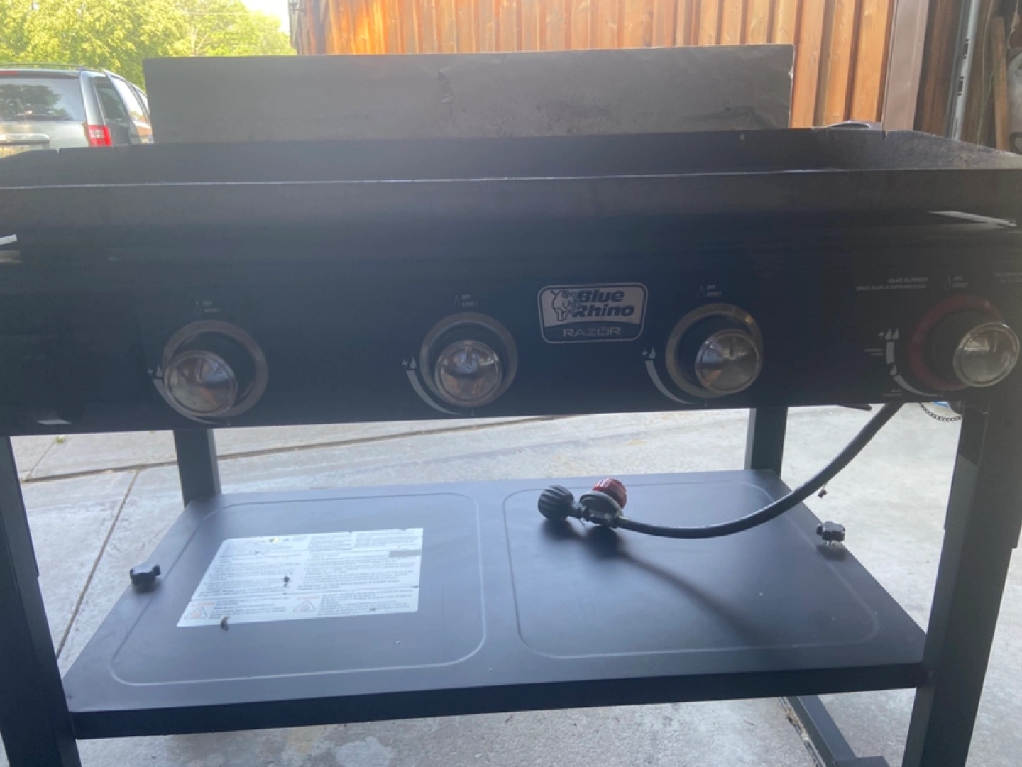 Selling a used Blue Rhino Razor griddle. It shows signs of use, but it's still functional. It has a black finish and measures approximately 38 inches wide and 23 inches deep.