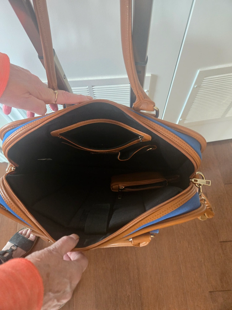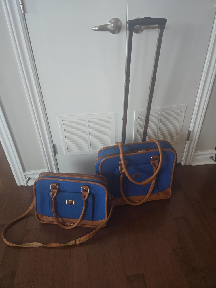 Selling a blue rolling suitcase/briefcase with a matching tote bag! Both are in great shape and perfect for travel or work. The suitcase has a retractable handle, and the tote bag can attach to the suitcase for easy transport. The set is blue with brown trim. Both have a compartment for laptop.
