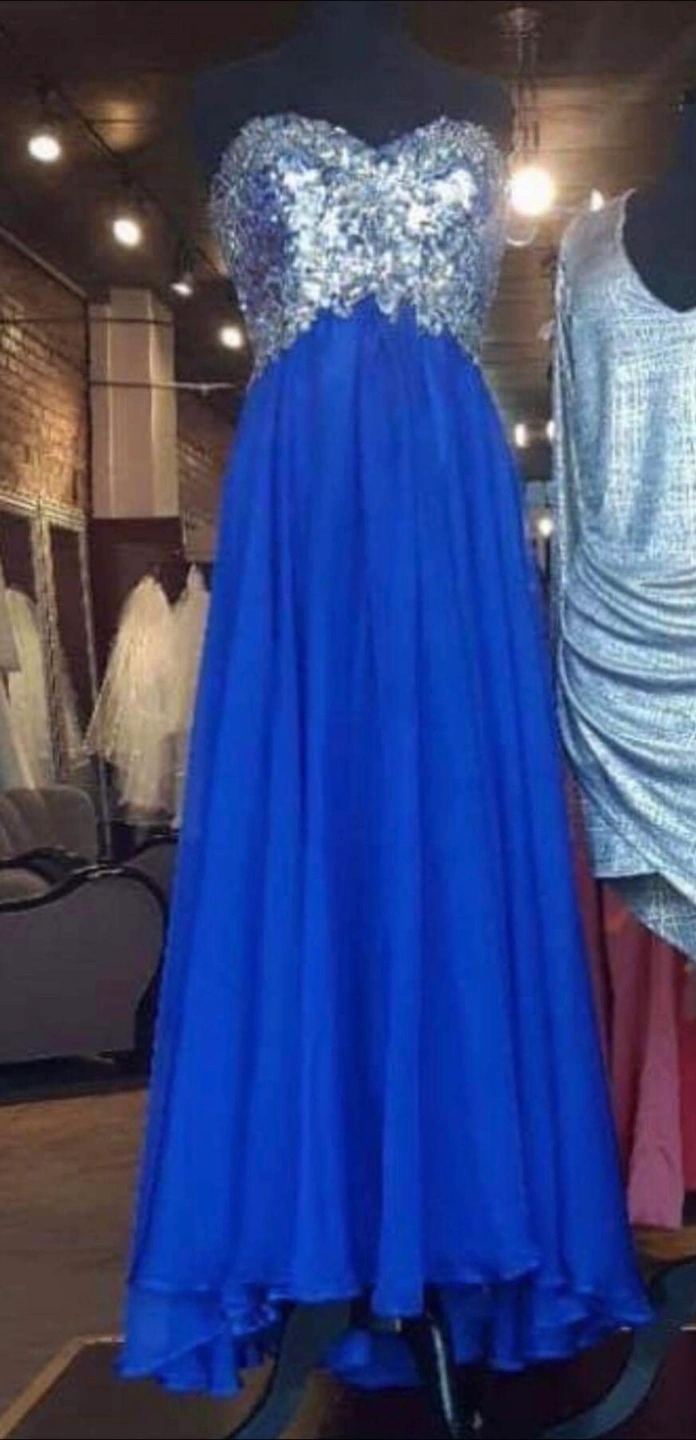 Here's a lovely blue formal dress with a sequin bodice. It's perfect for a special occasion