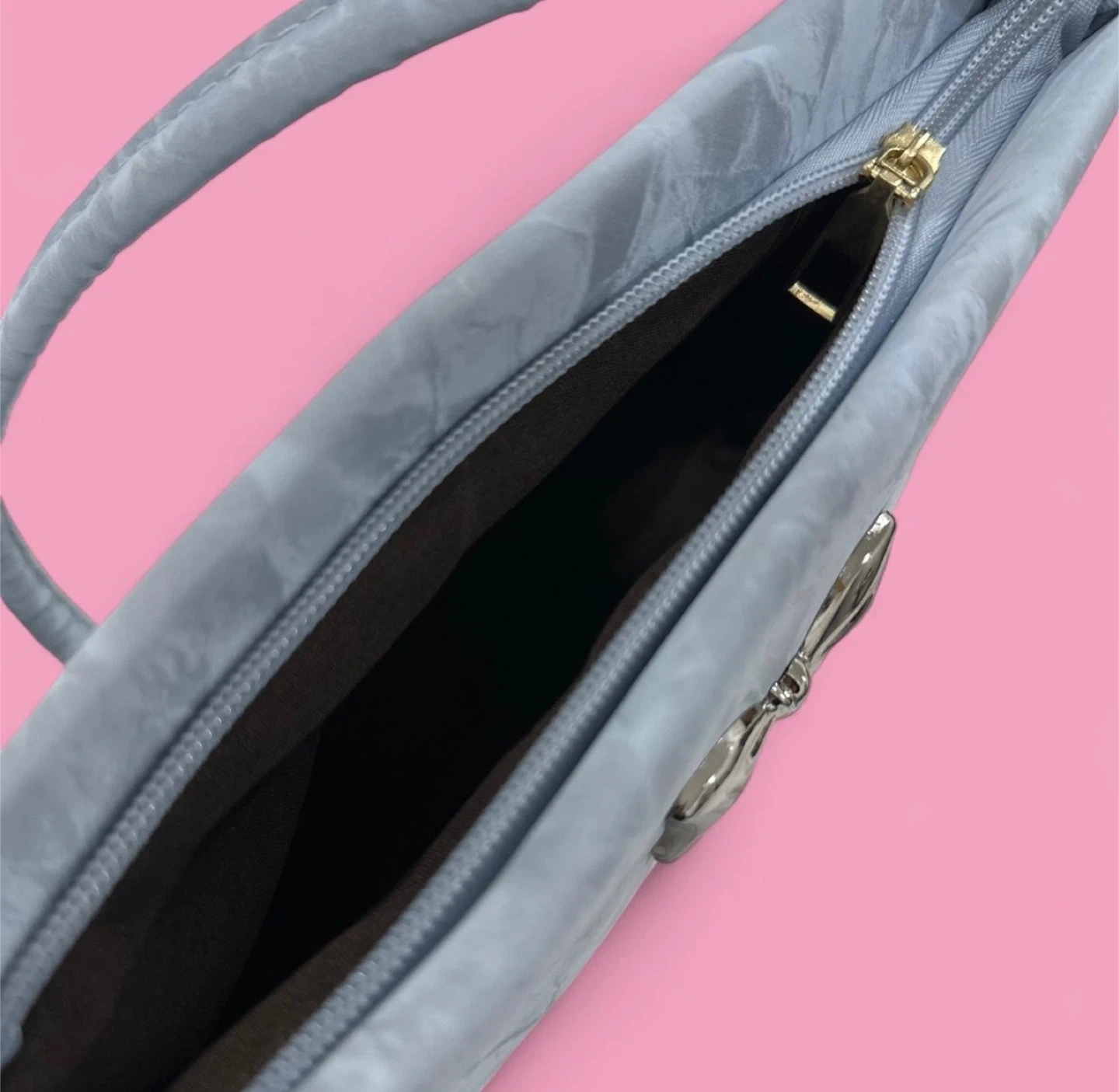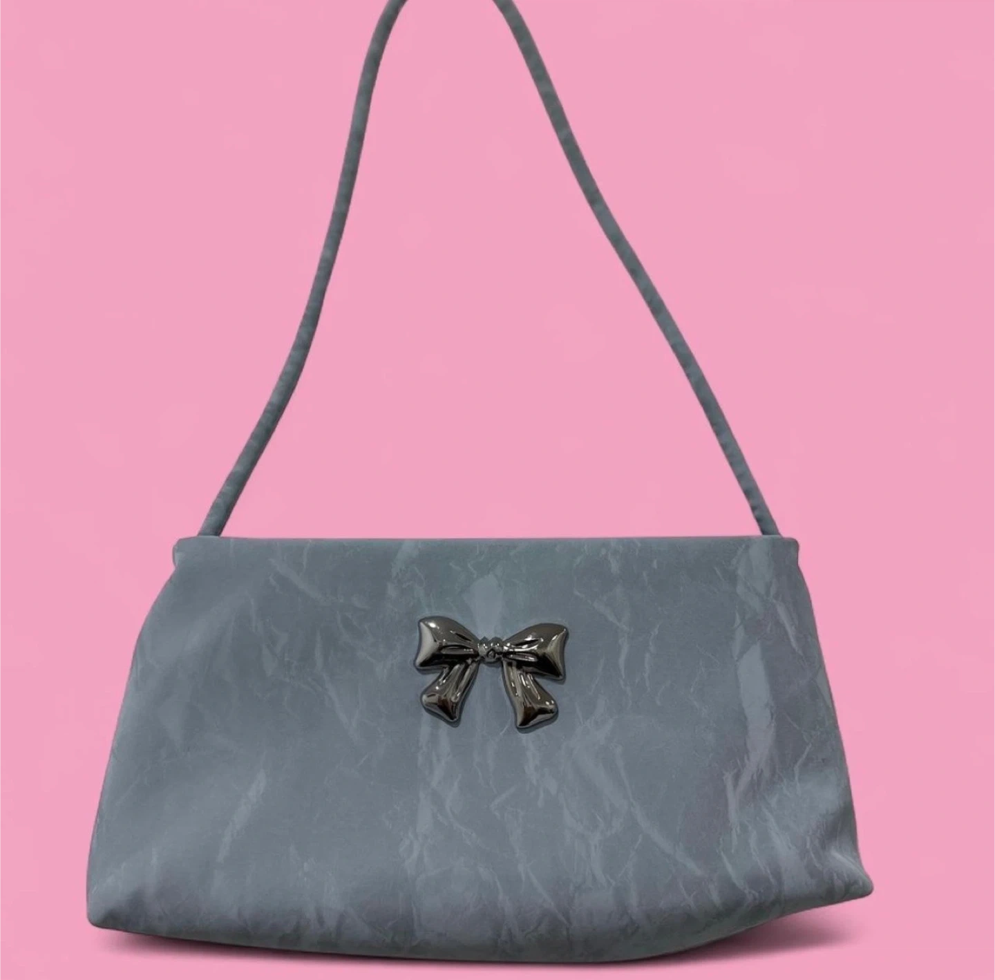 Cute blue shoulder bag with a bow detail! It's in great condition and perfect for adding a touch of charm to any outfit. It has a zipper closure to keep your belongings safe and secure