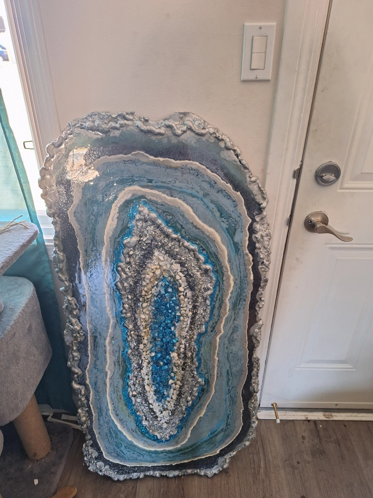 Beautiful handmade resin geode wall art! It features layers of blues, silvers, and sparkling accents to mimic the look of a natural geode. A unique piece to add some sparkle to your space